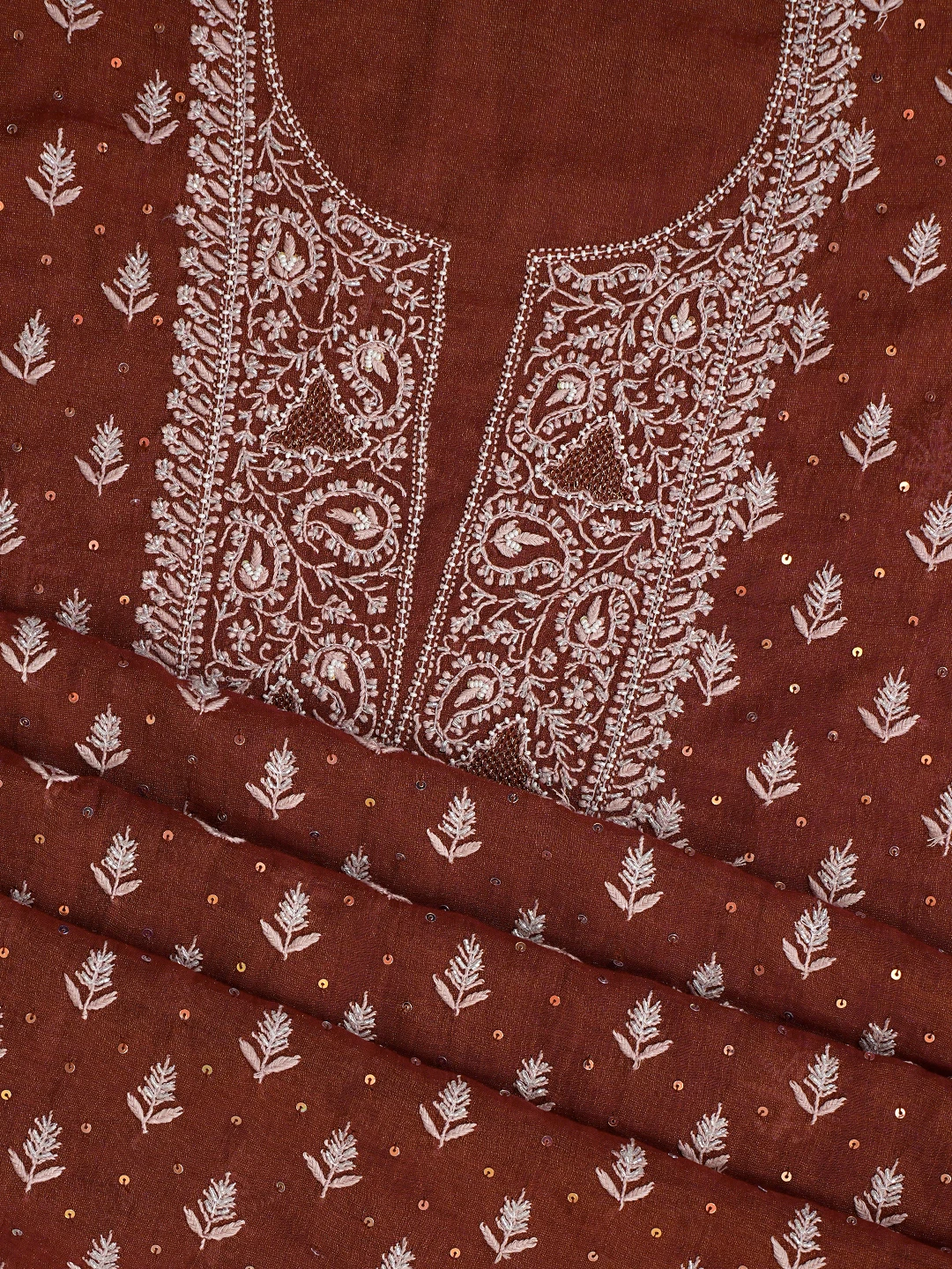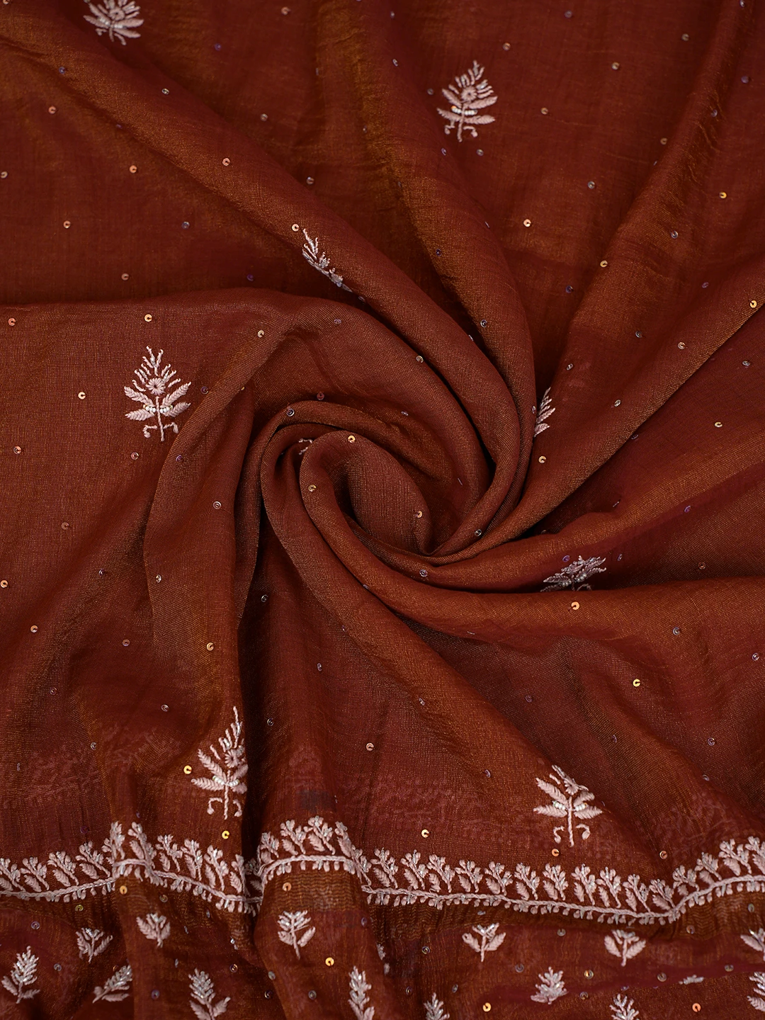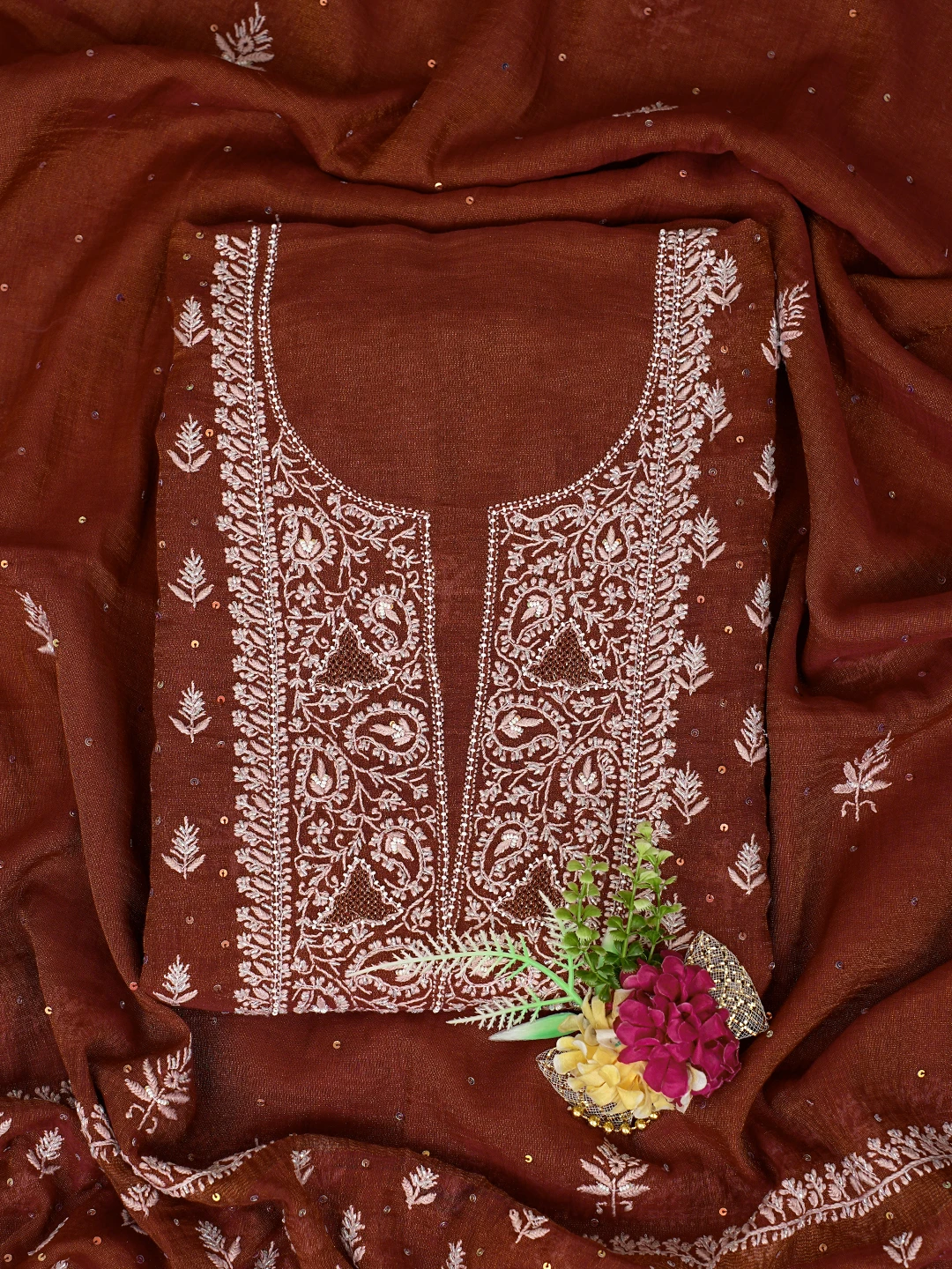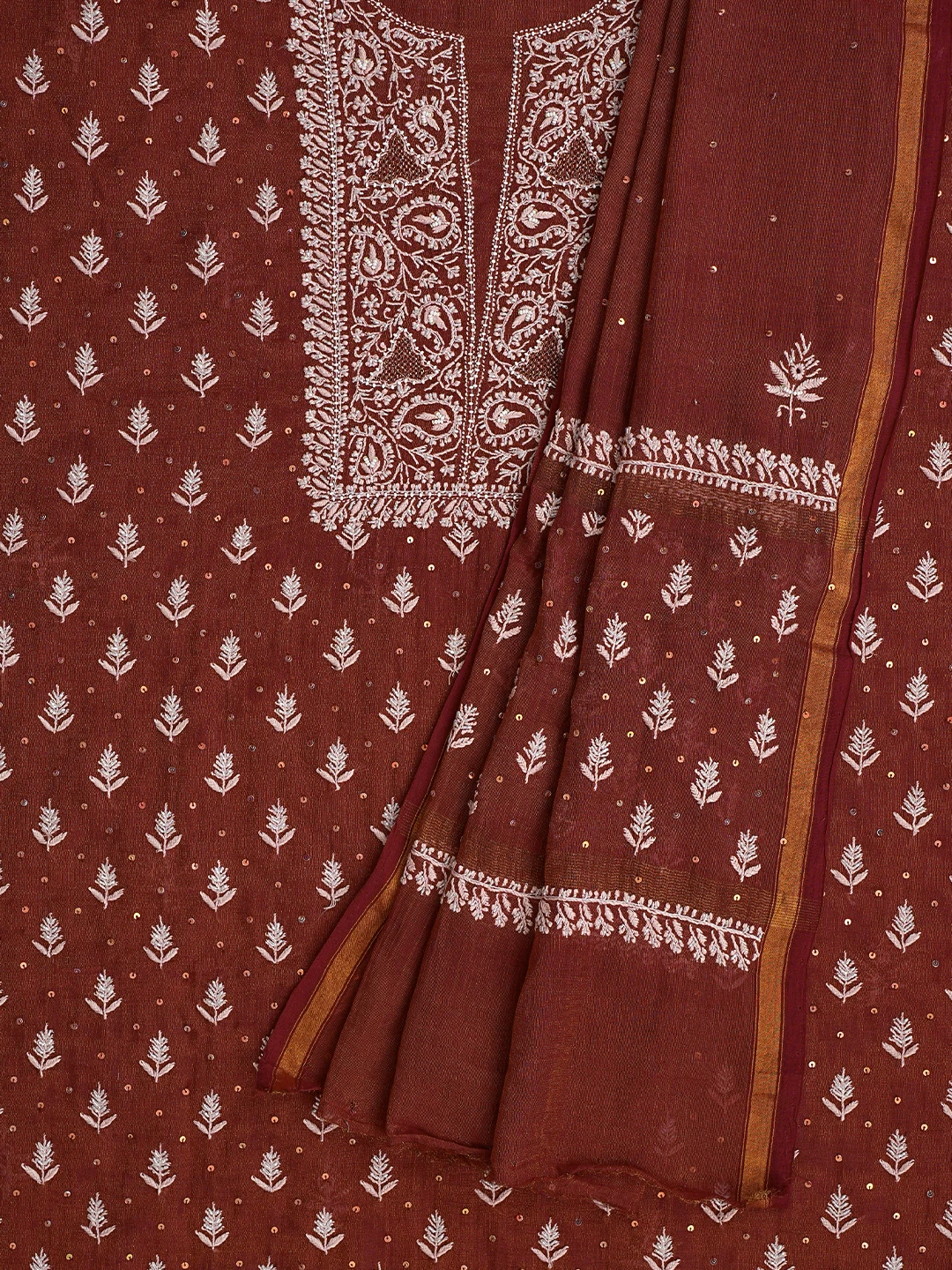 Ada Hand Embroidered Rust Tissue Lucknowi Chikankari Unstitched Kurta Dupatta Set With Cutdana Work 01A662258
