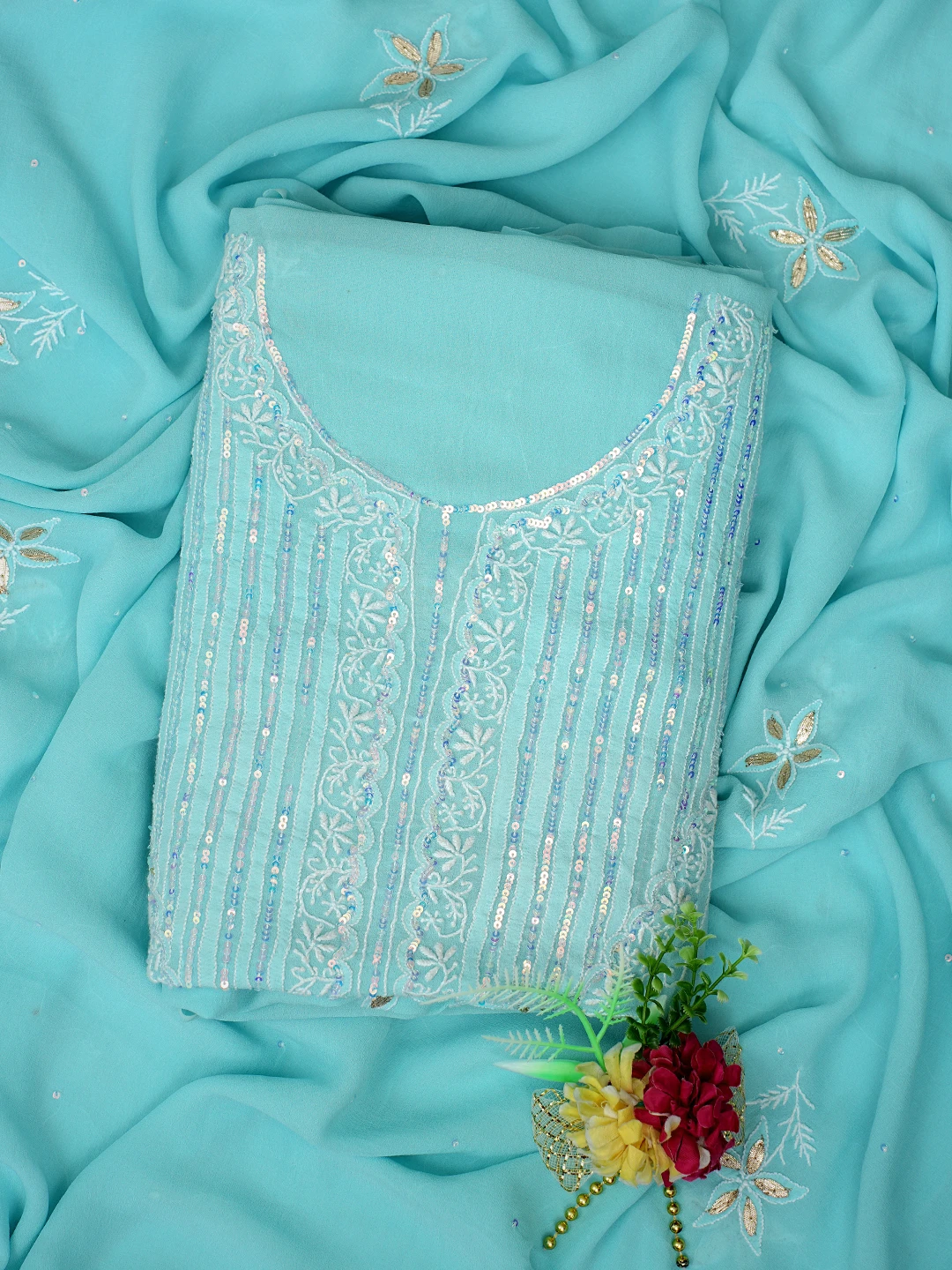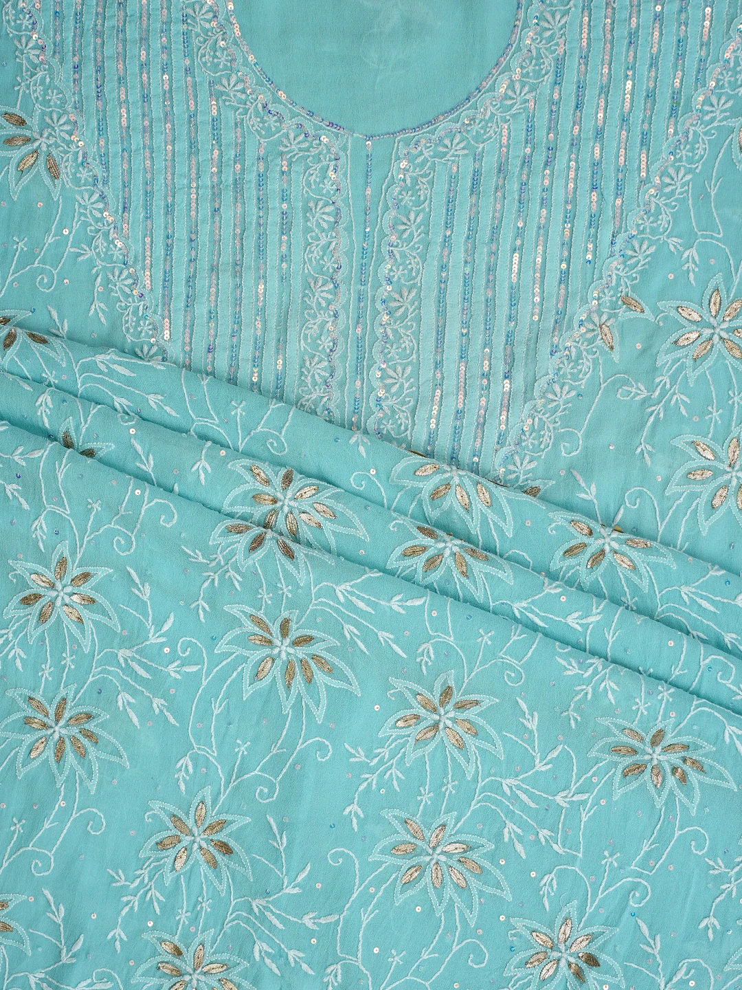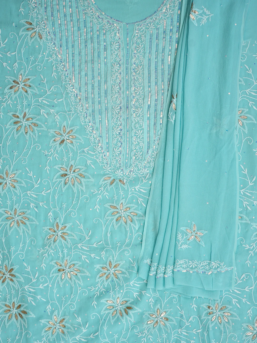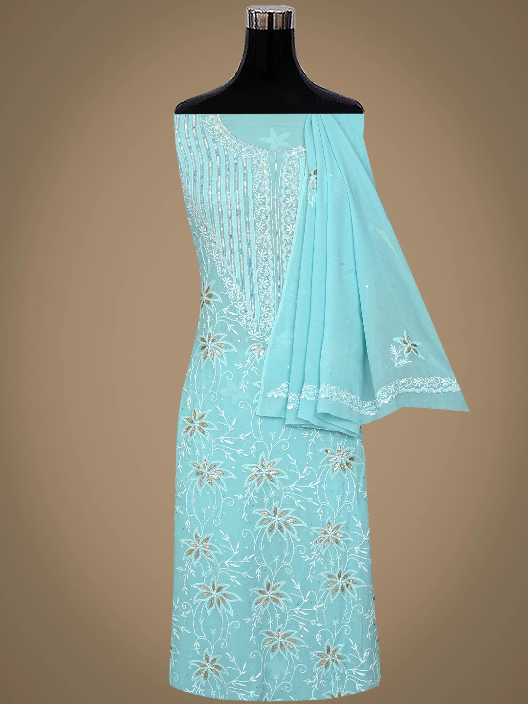 Ada Hand Embroidered Sky Blue Pure Georgette Lucknowi Chikankari Unstitched Kurta Dupatta Set With Sequinned Work 01A384478