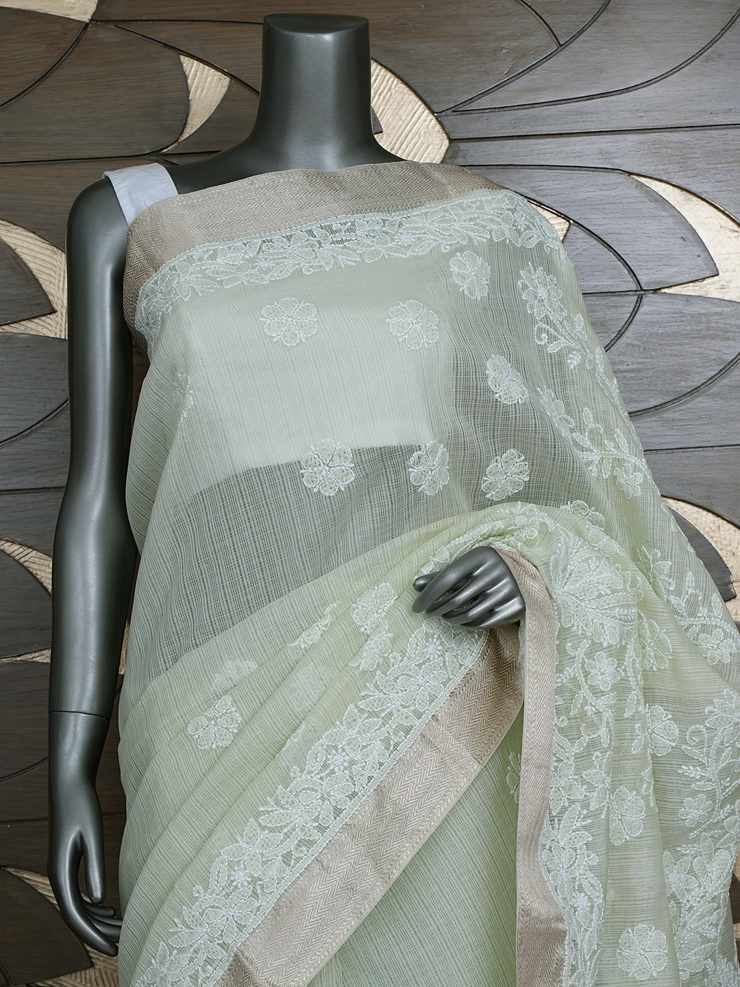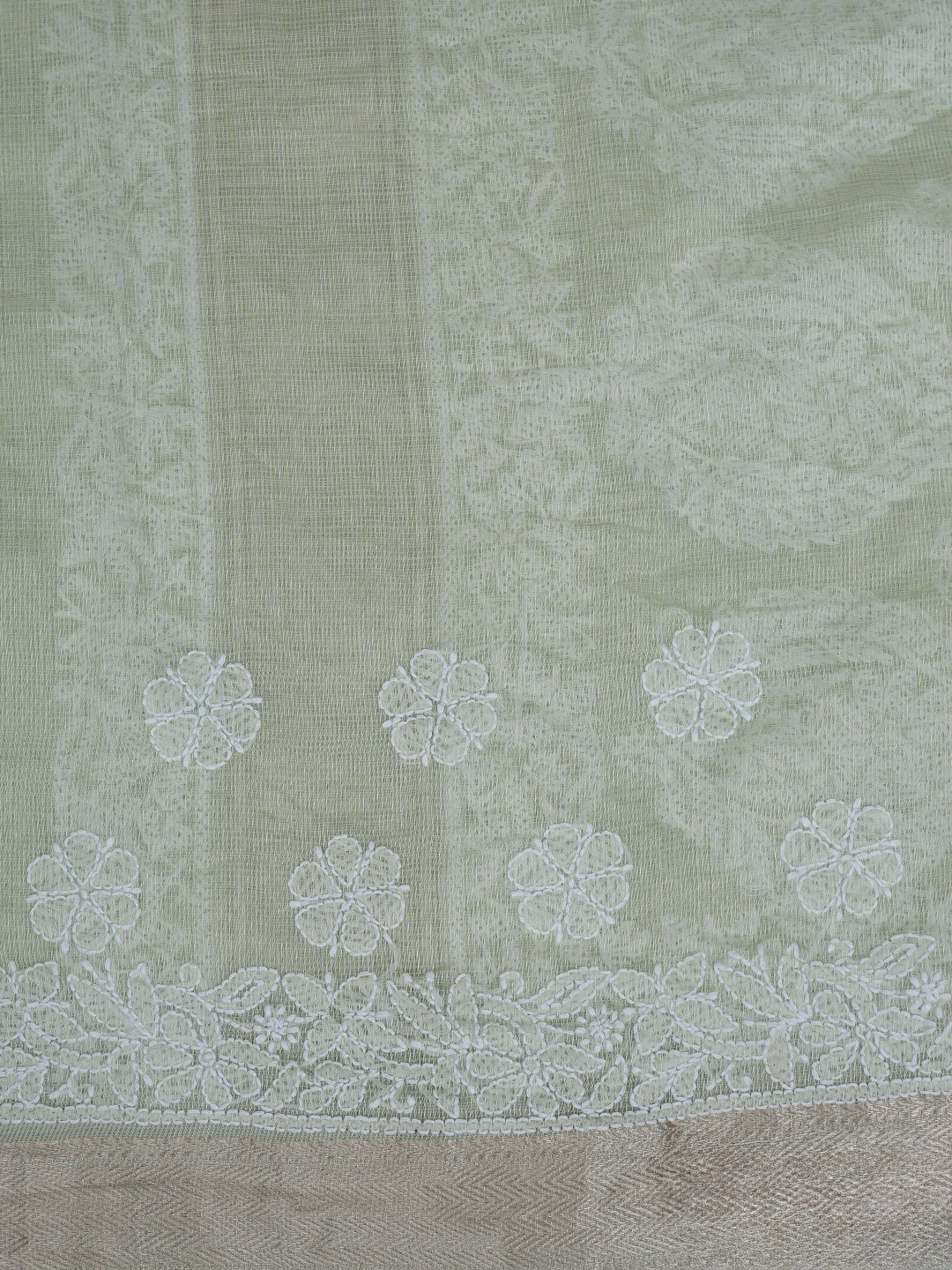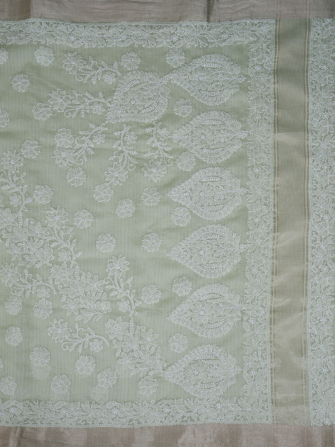 Ada Hand Embroidered Tea Green Chanderi Lucknowi Chikankari Saree With Blouse 01A863307