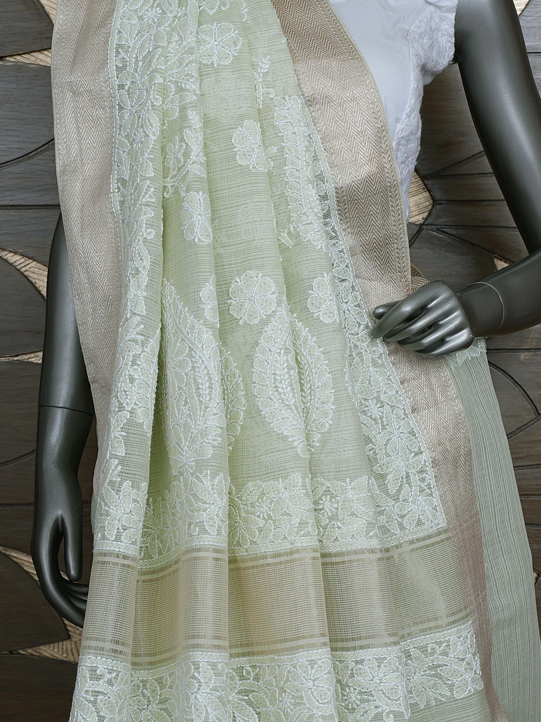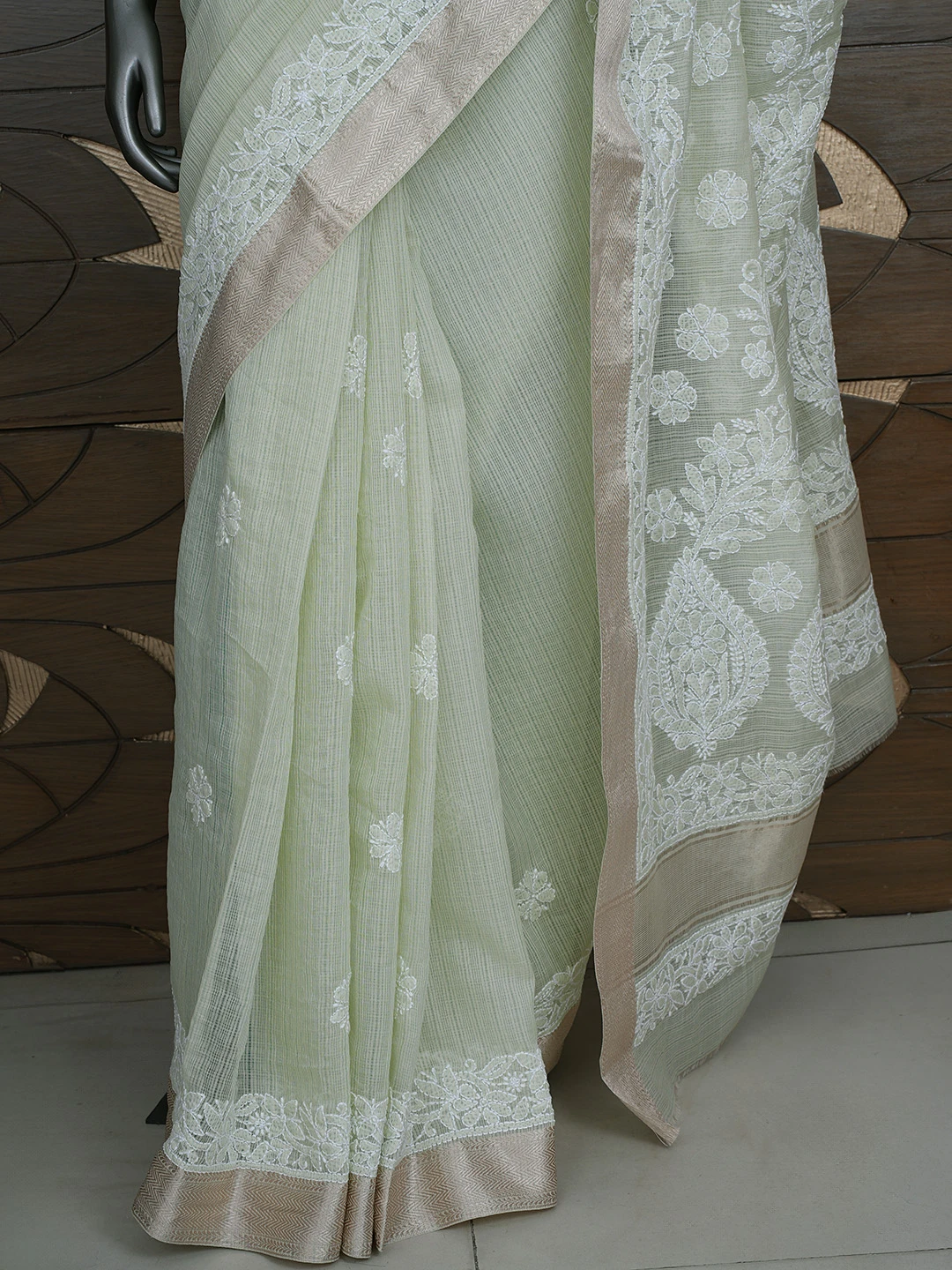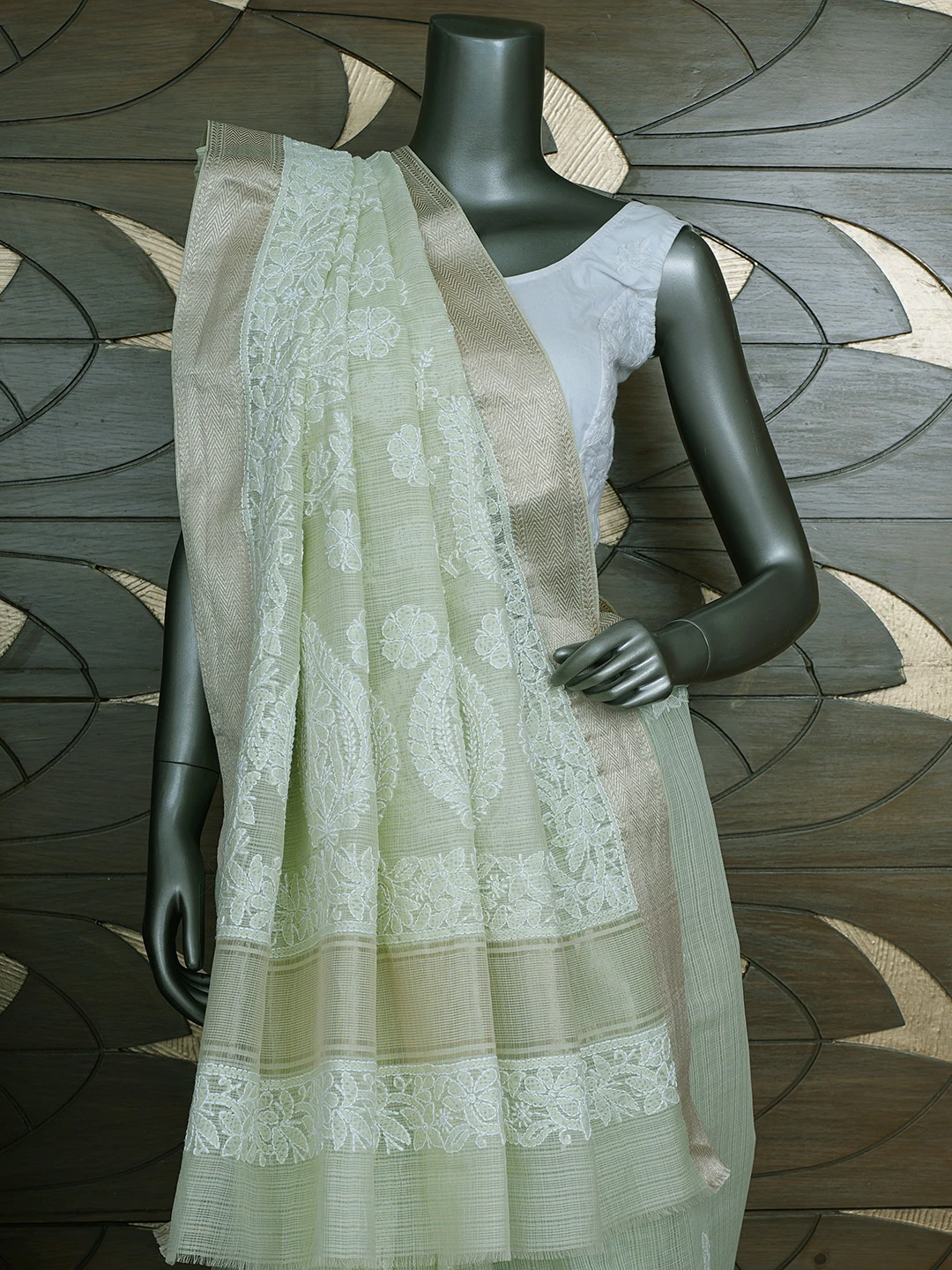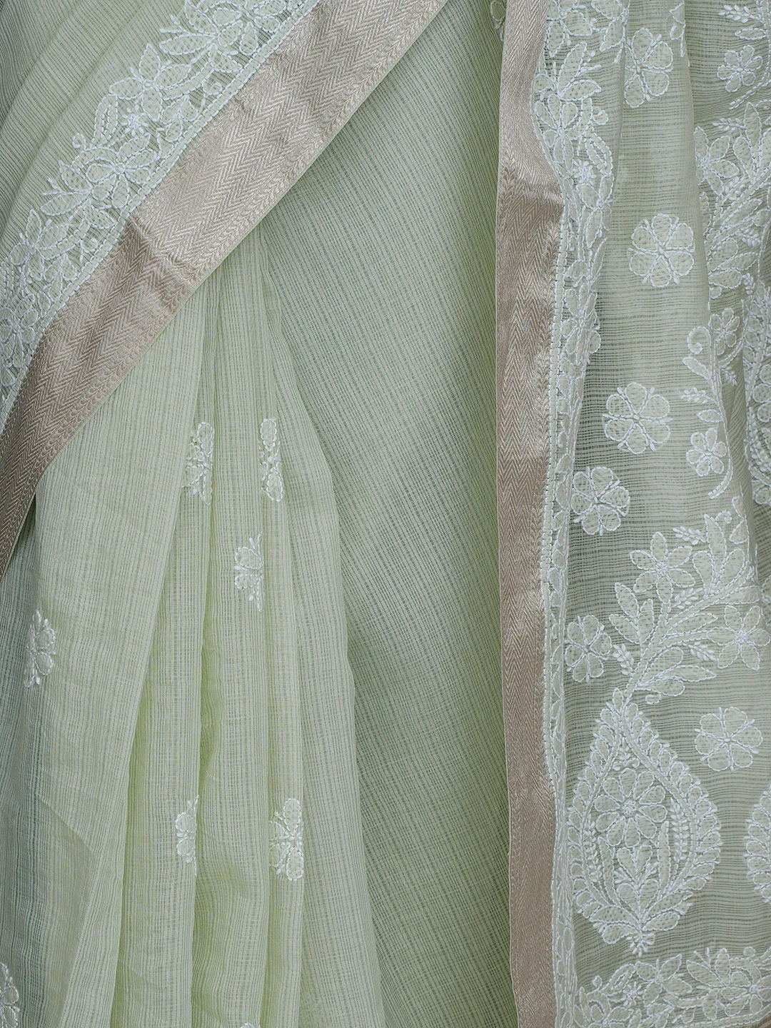 Ada Hand Embroidered Tea Green Chanderi Lucknowi Chikankari Saree With Blouse 01A863307