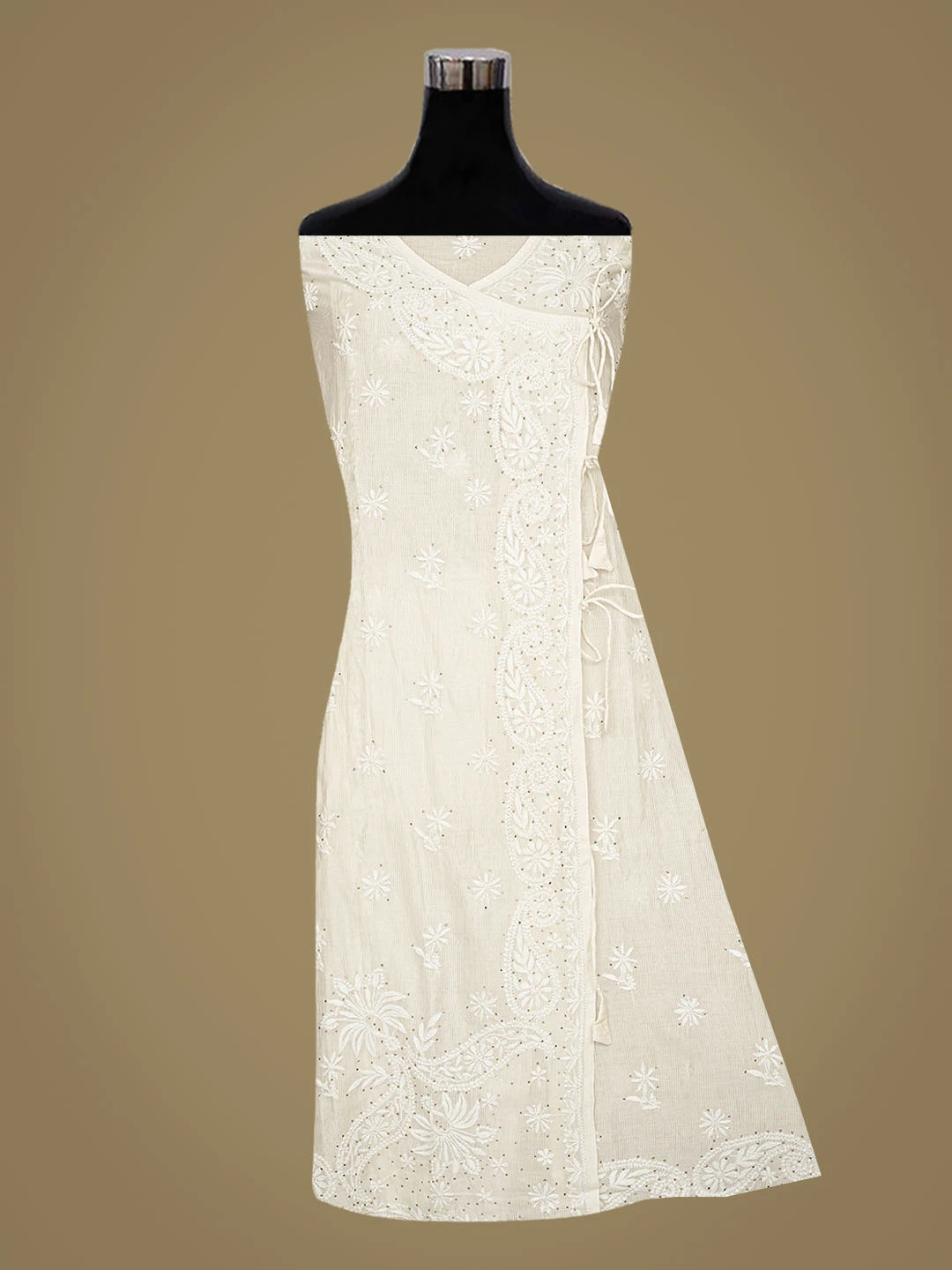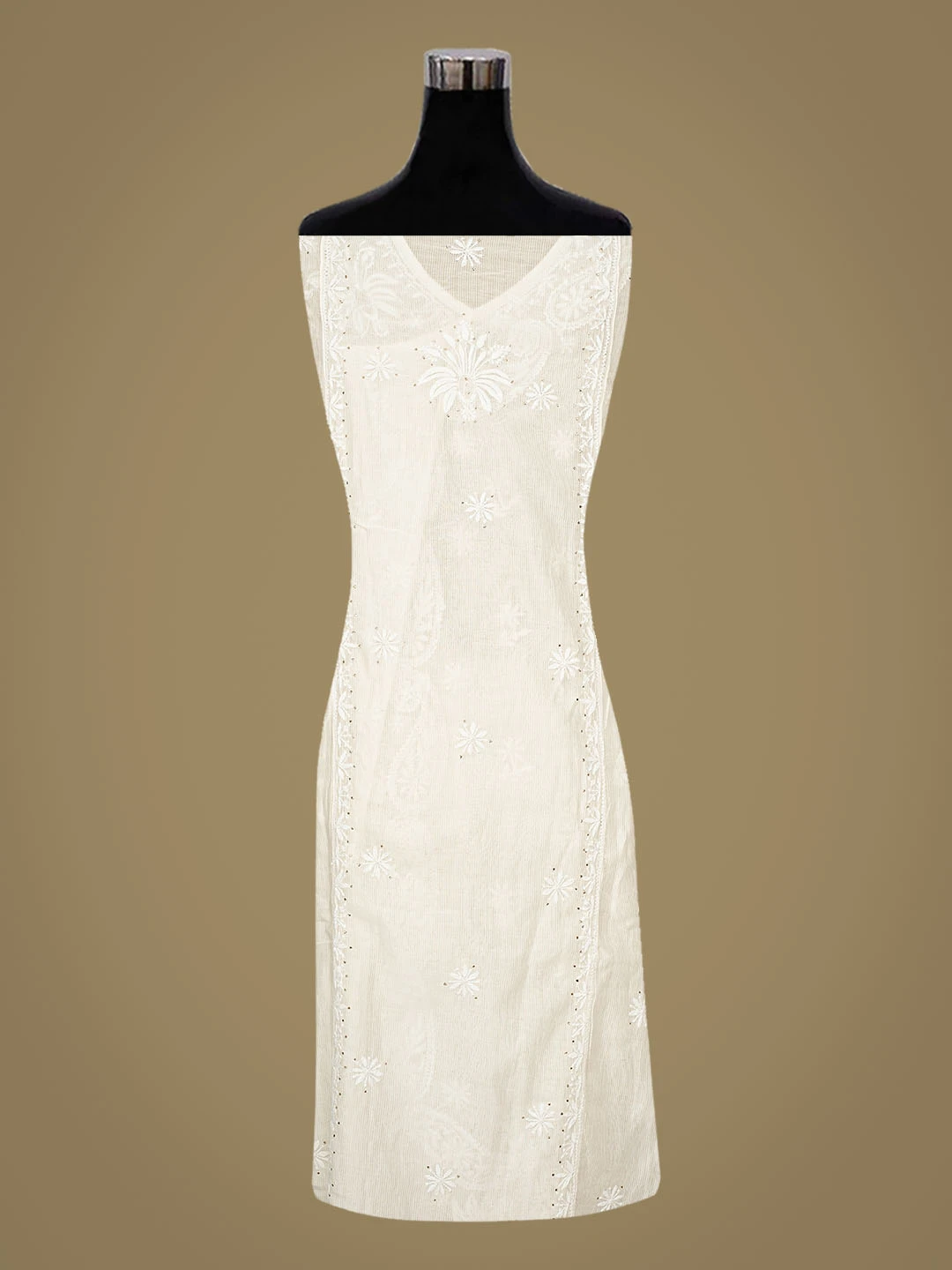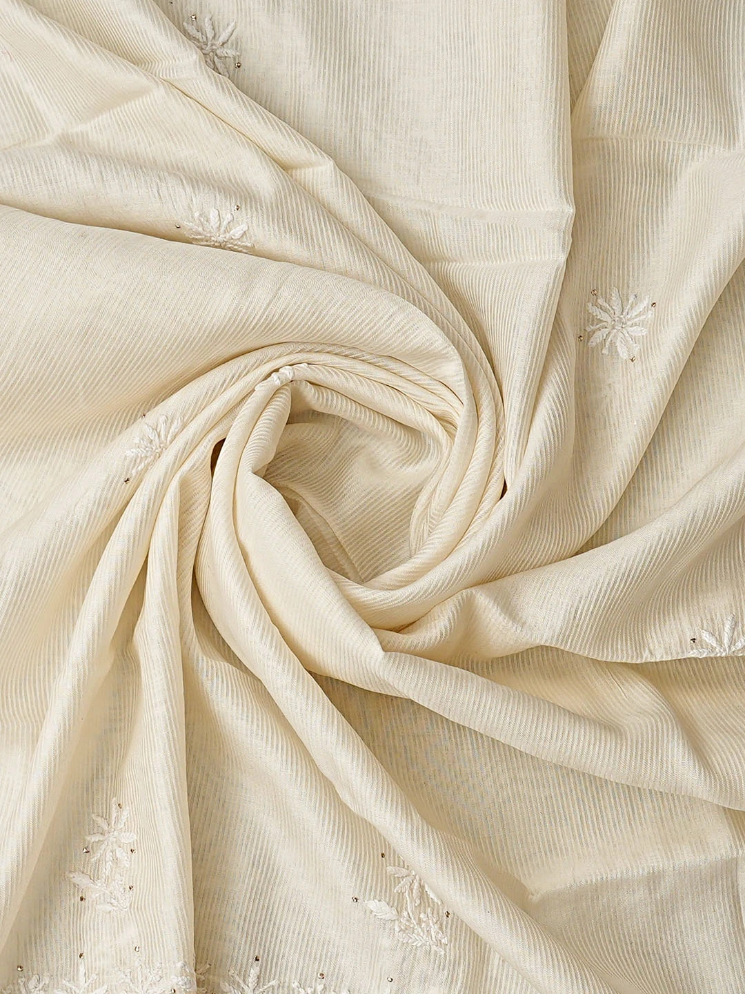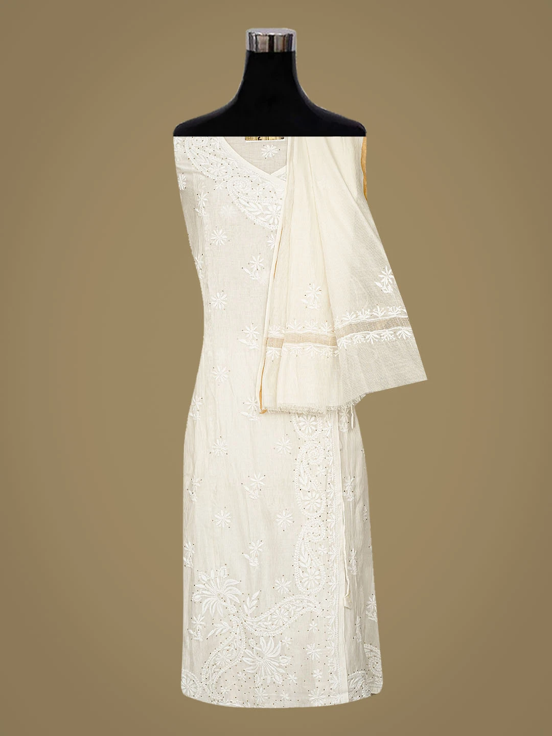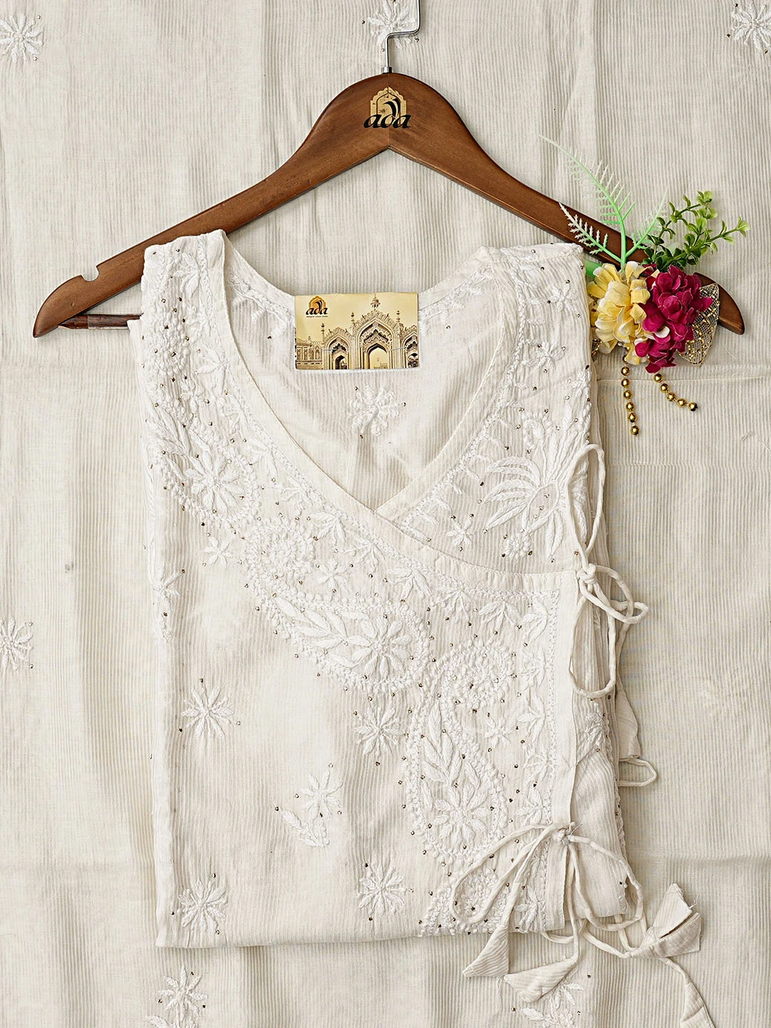 Ada Hand Embroidered White Chanderi Lucknowi Chikankari Semi-Stitched Kurta Dupatta Set With Mukaish Work 01A658824
