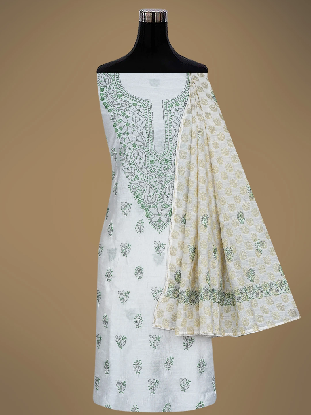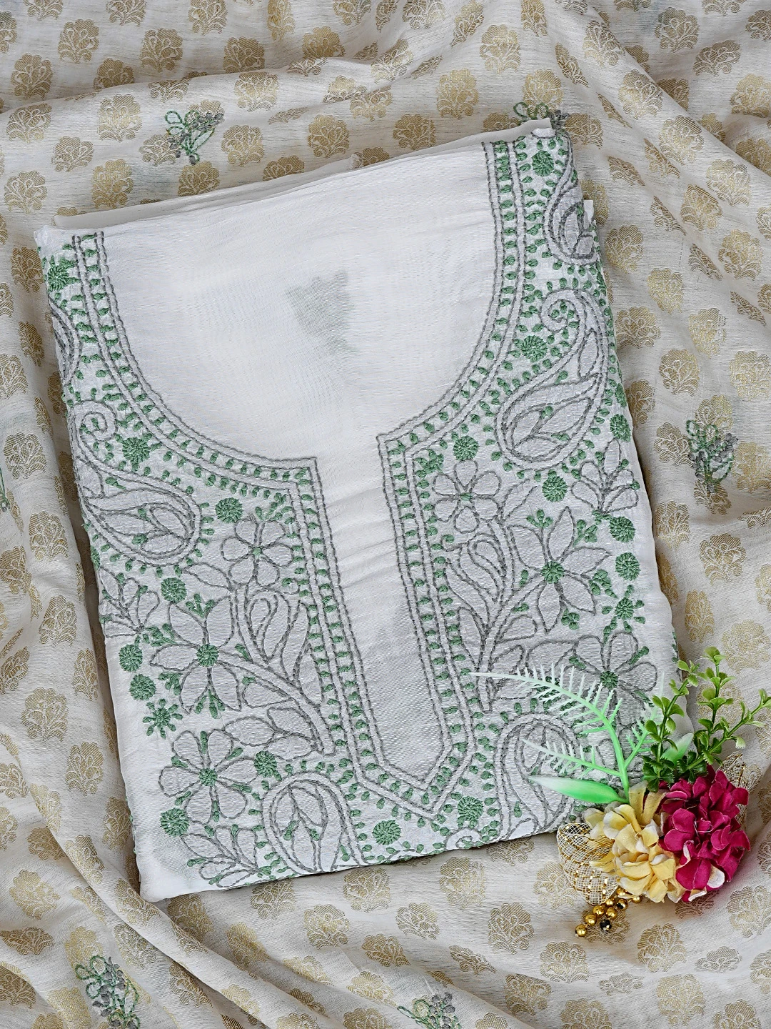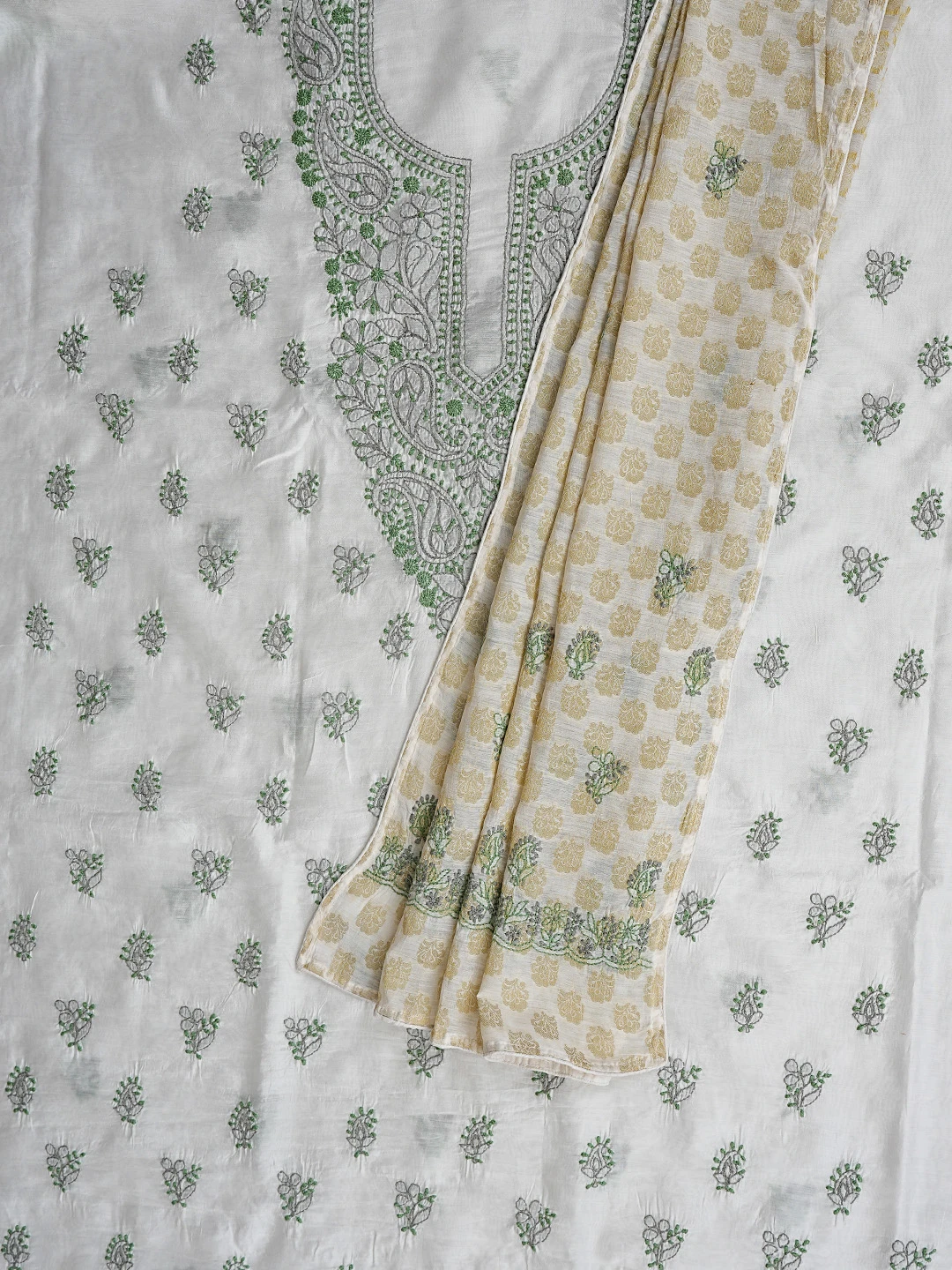 Ada Hand Embroidered White Chanderi Lucknowi Chikankari Unstitched Kurta Dupatta Set 01A871555