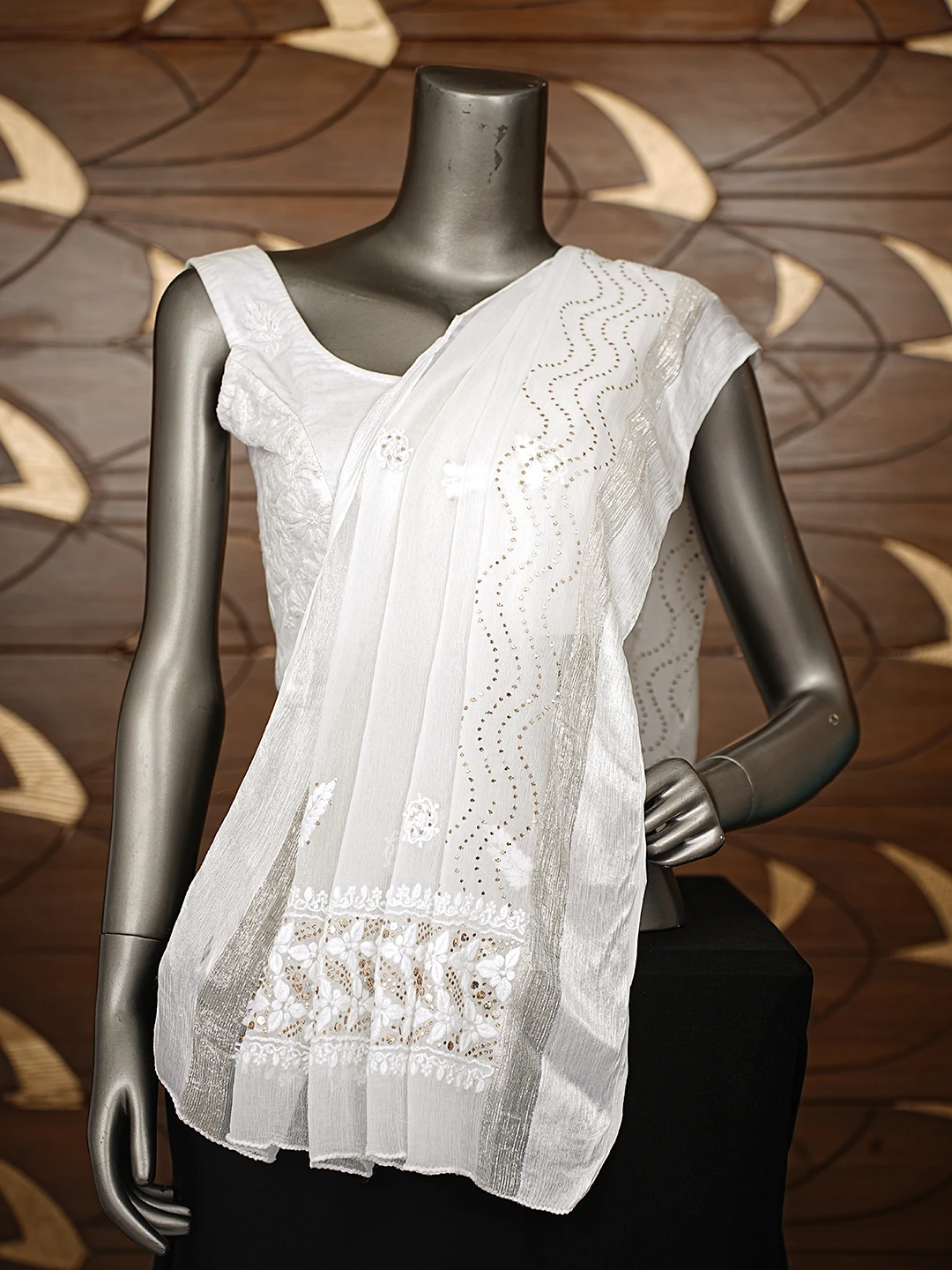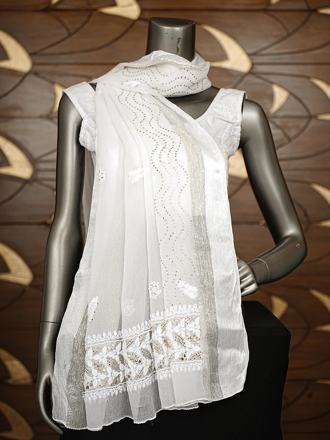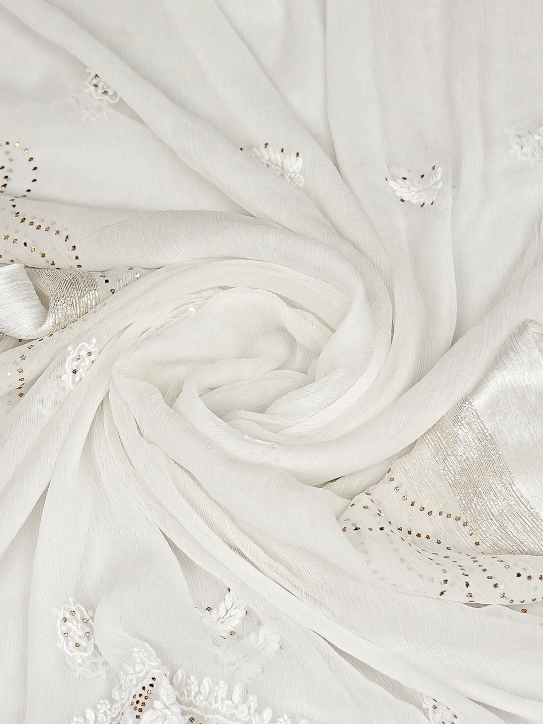 Ada Hand Embroidered White Chiffon Lucknowi Chikankari Dupatta With Mukaish Work 01A767532