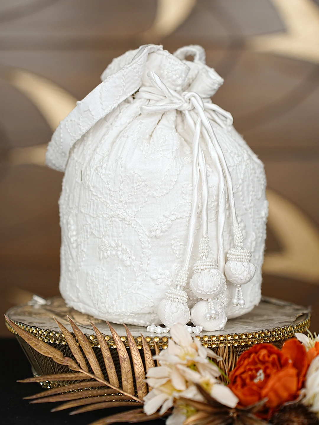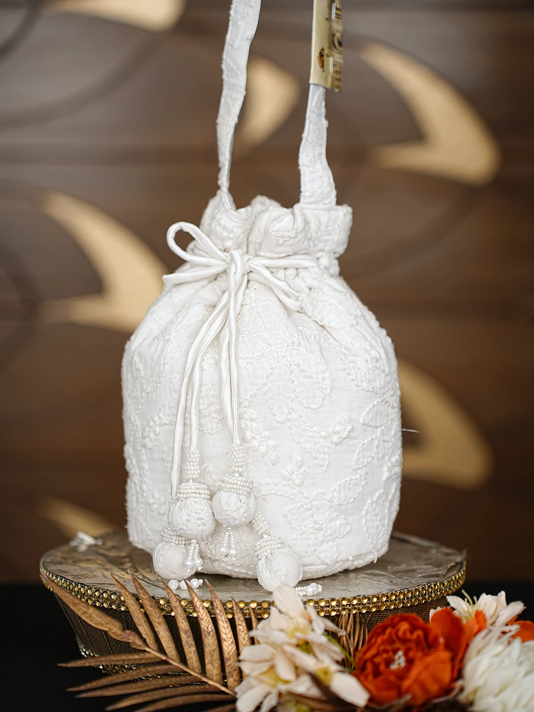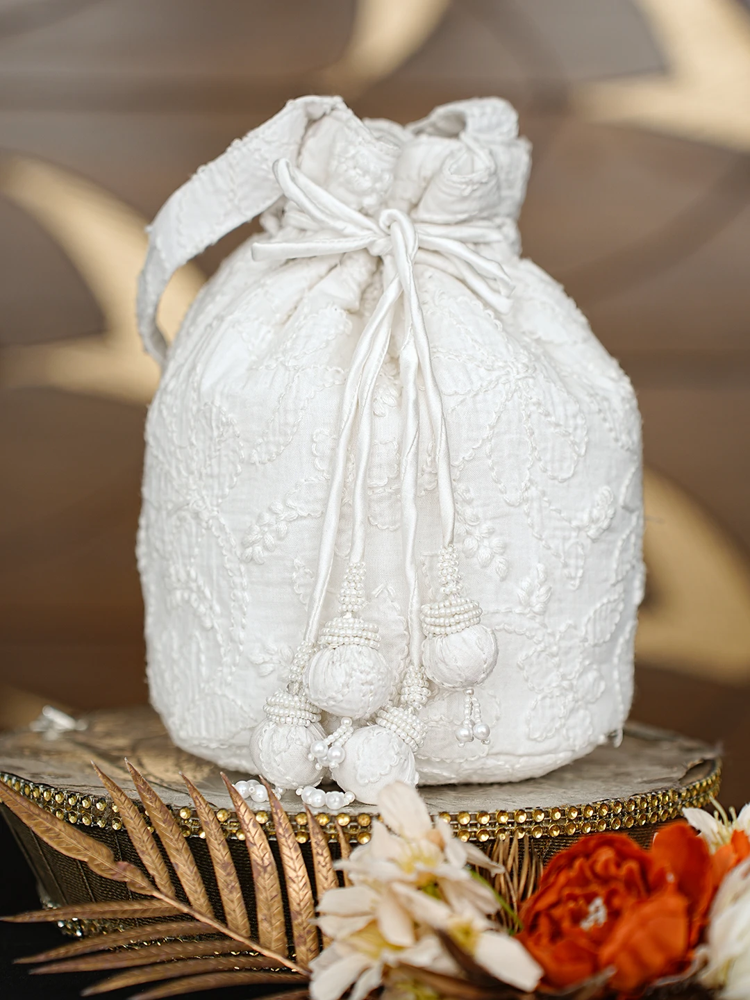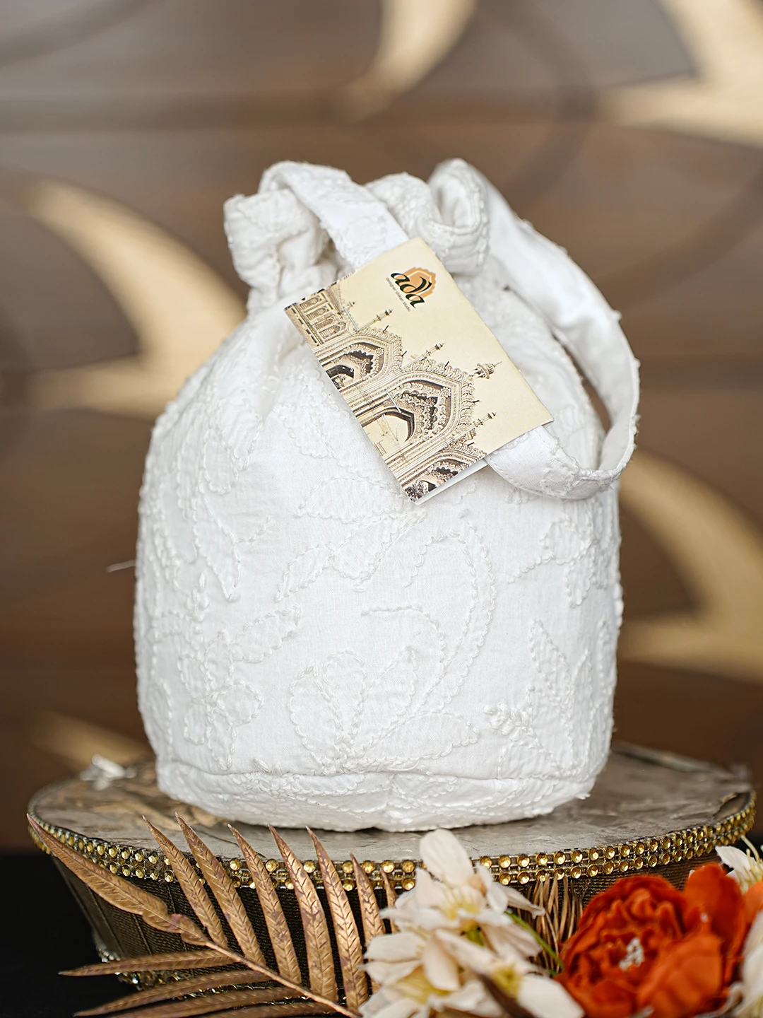 Ada Hand Embroidered White Cotton Lucknowi Chikankari Potli Bag 01A811610