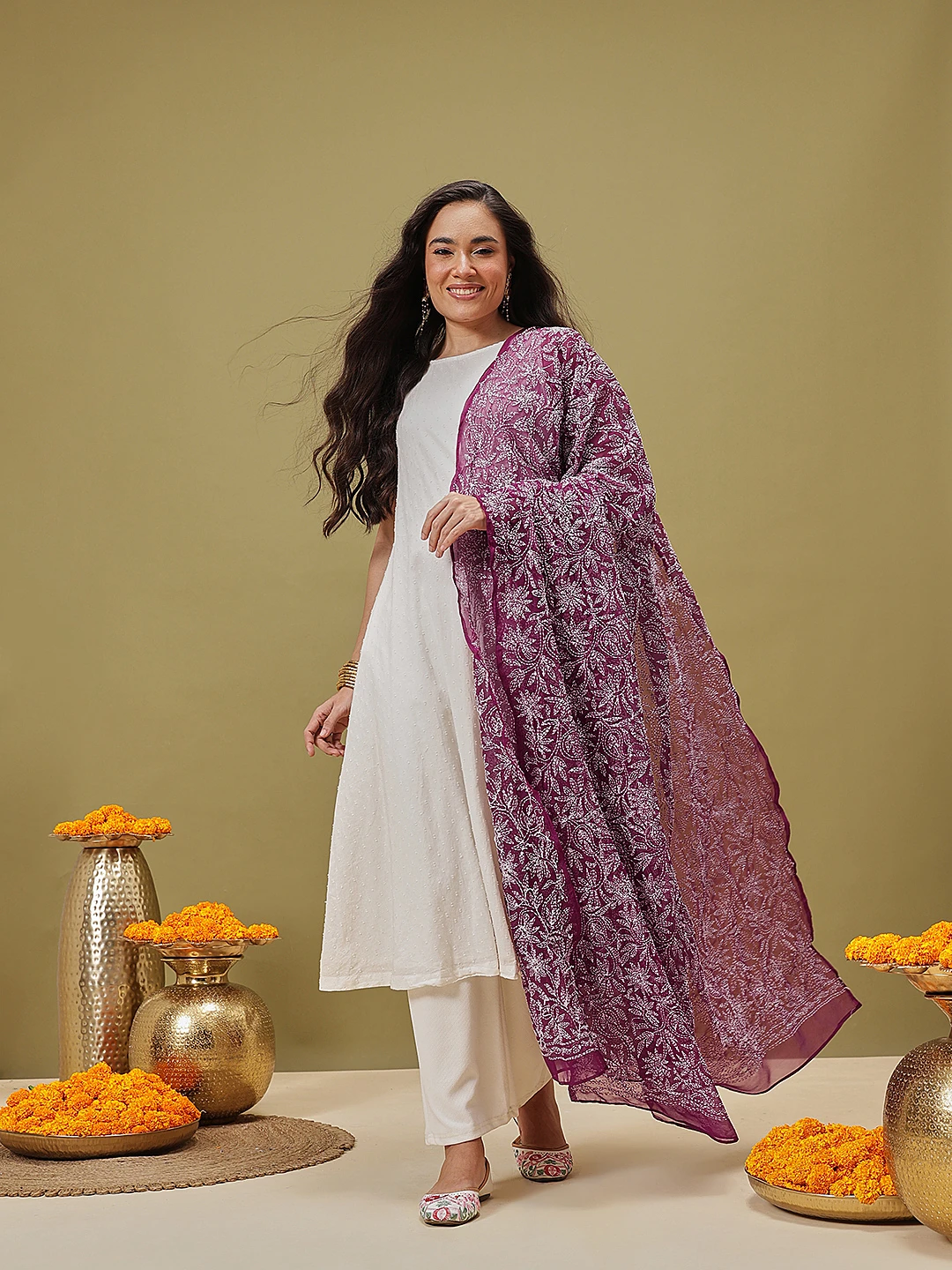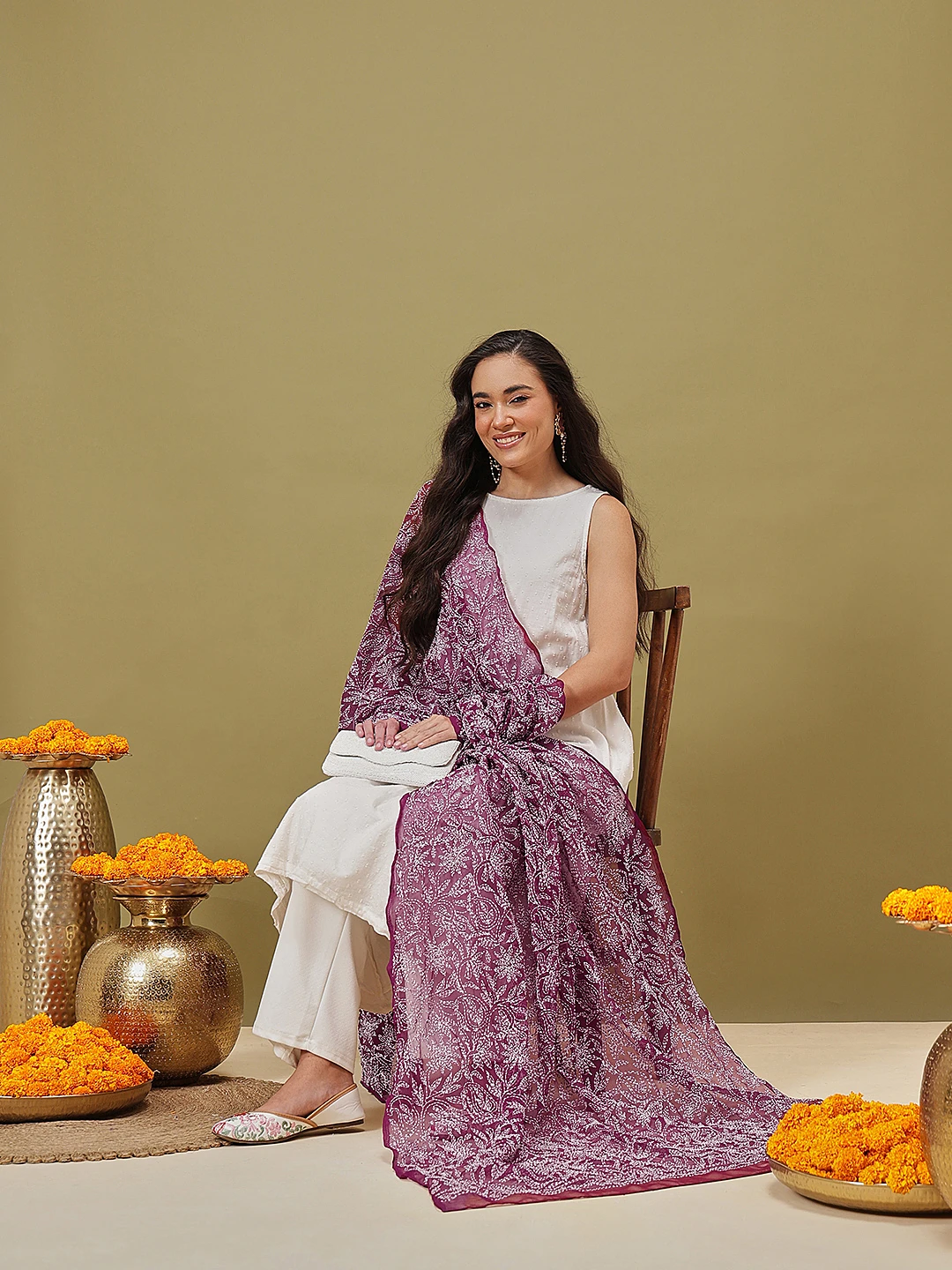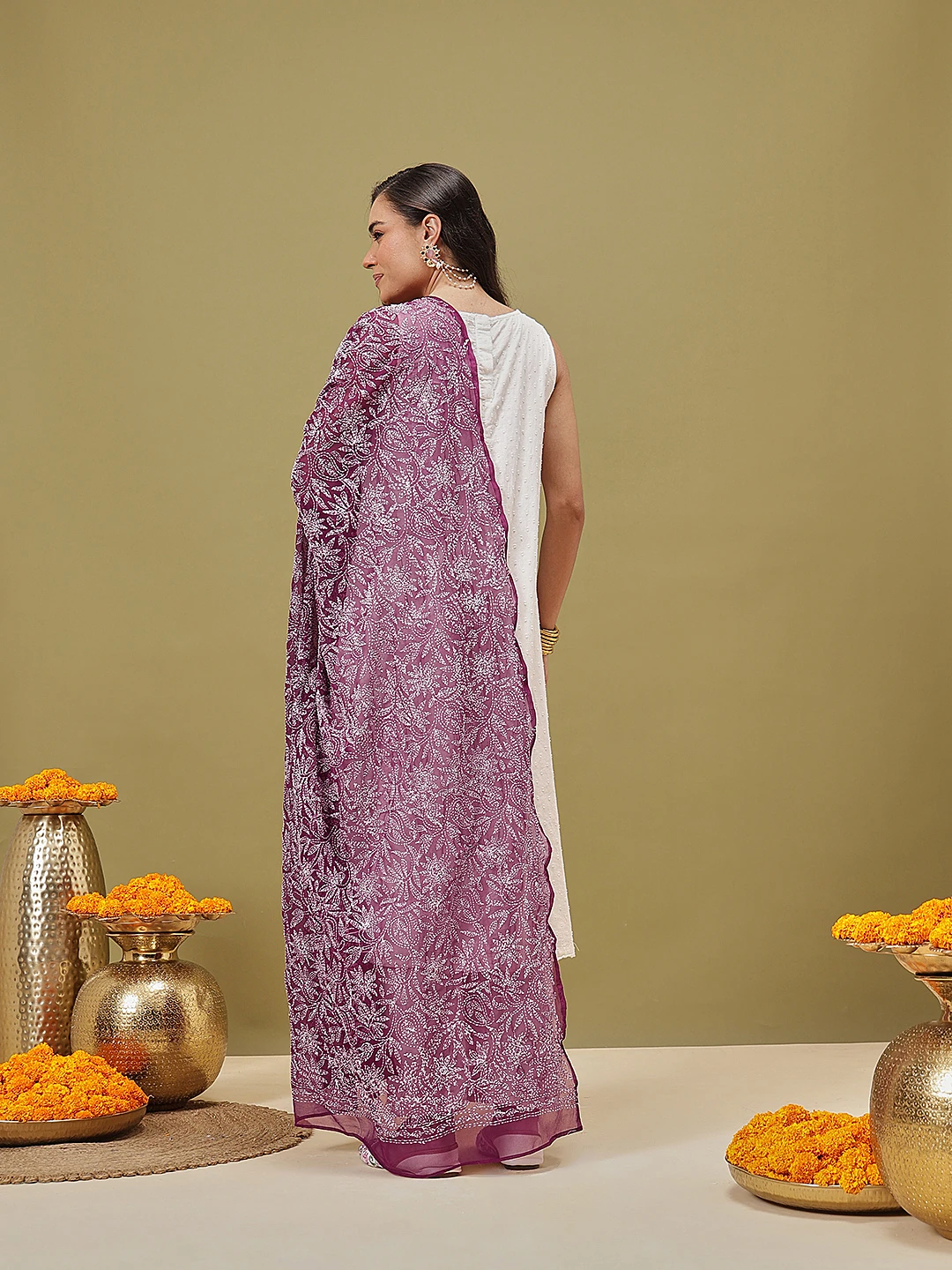 Ada Hand Embroidered Wine Georgette Lucknowi Chikankari Dupatta A511228