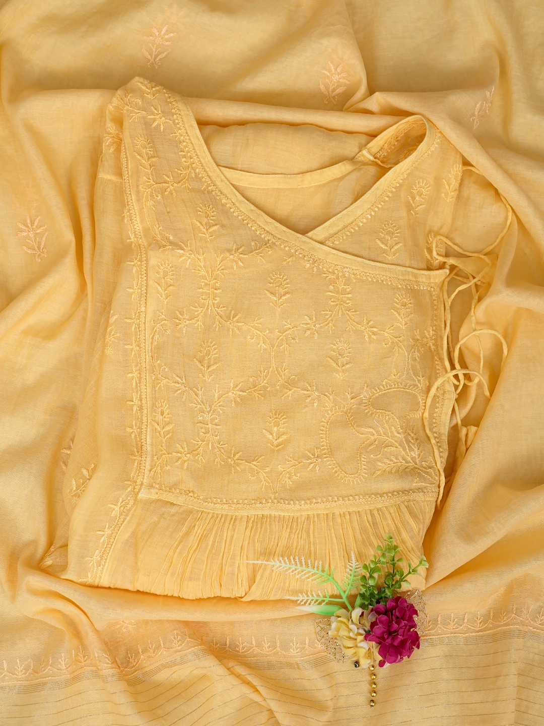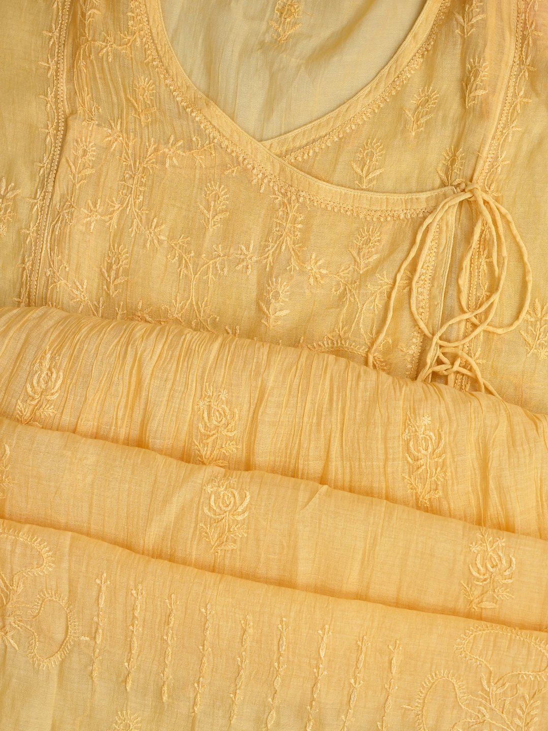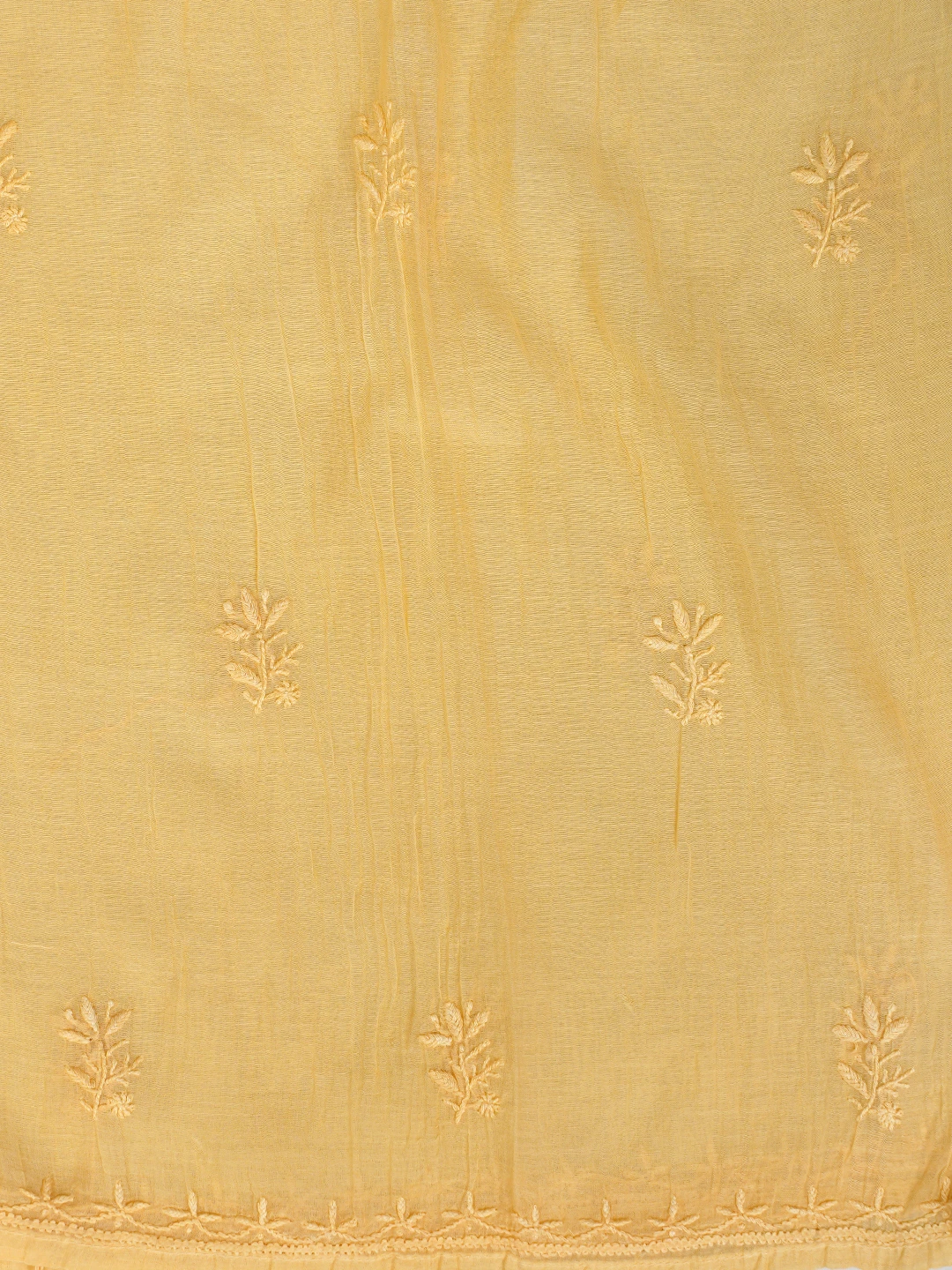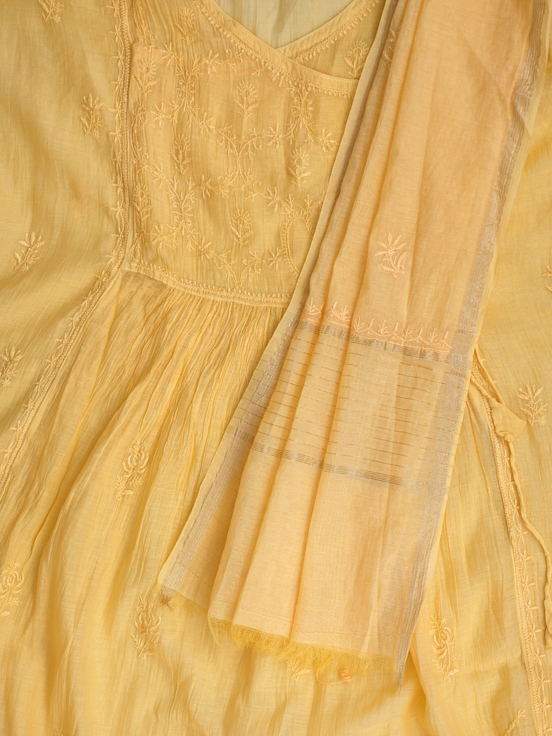 Ada Hand Embroidered Yellow Chanderi Lucknowi Chikankari Semi-Stitched Kurta Dupatta Set 01A741500