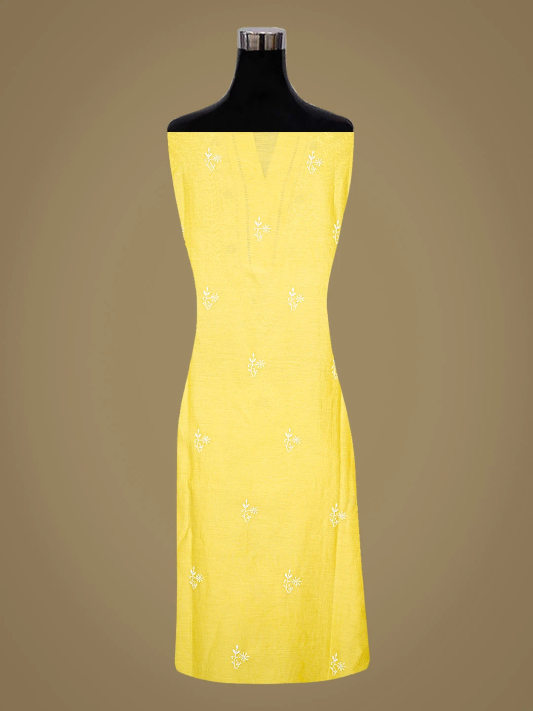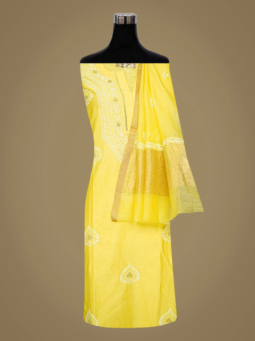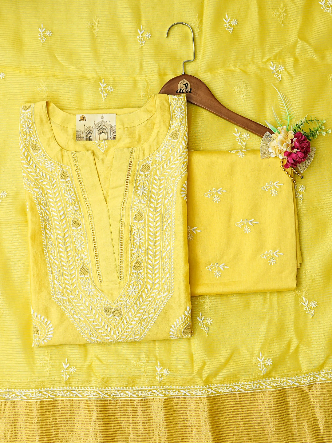 Ada Hand Embroidered Yellow Chanderi Lucknowi Chikankari Semi-Stitched Suit Piece With Zari Work 01A662140