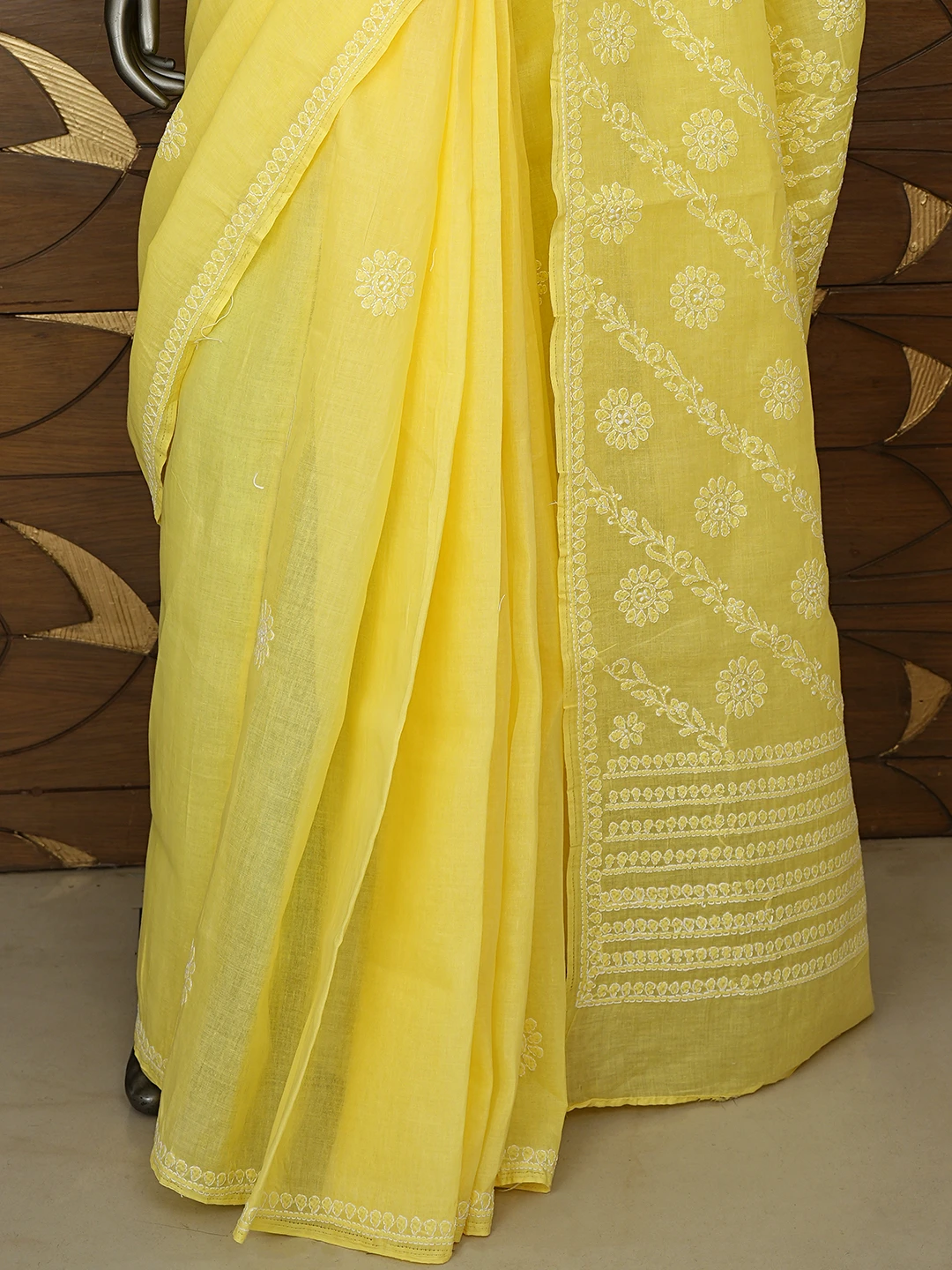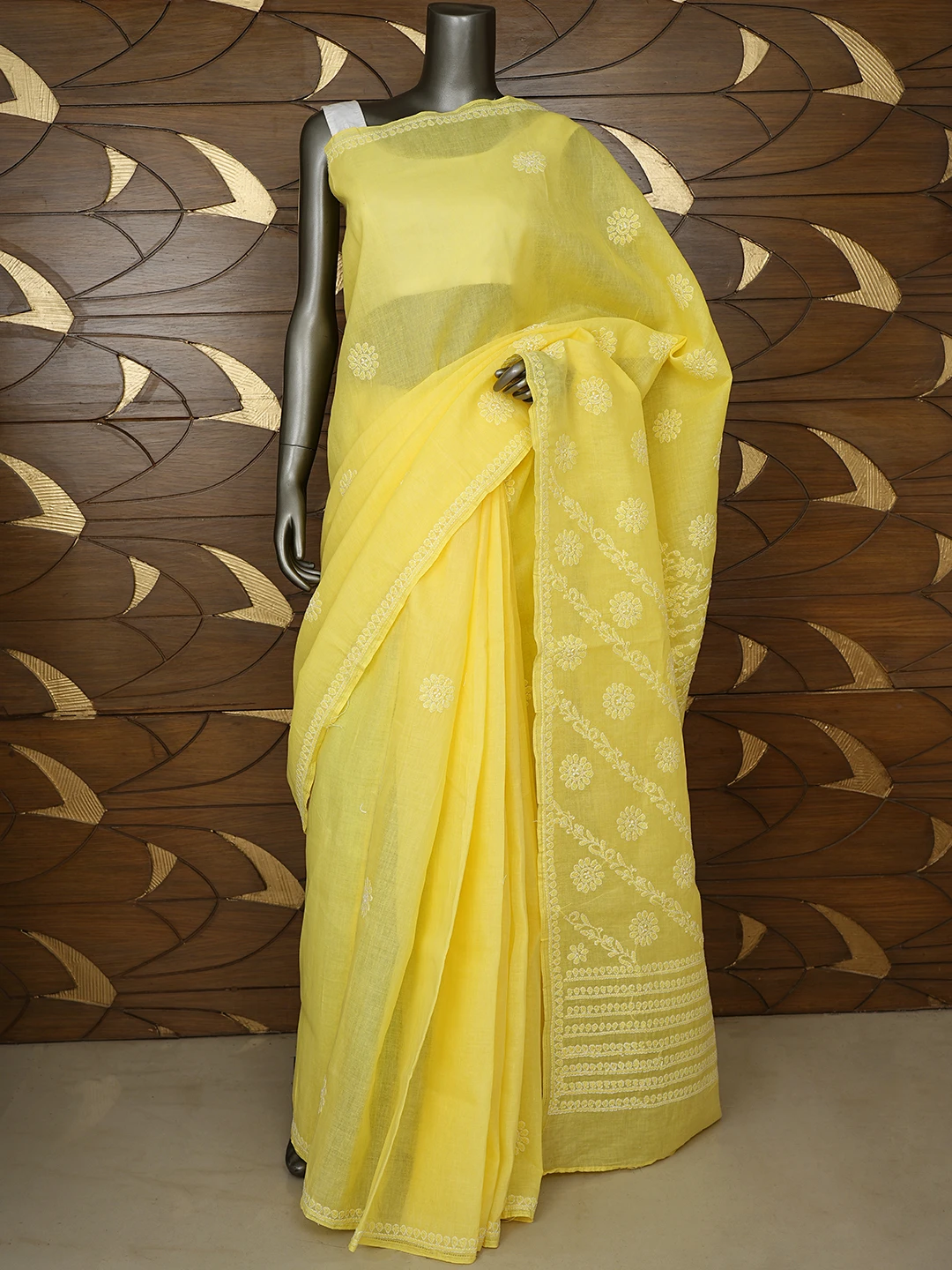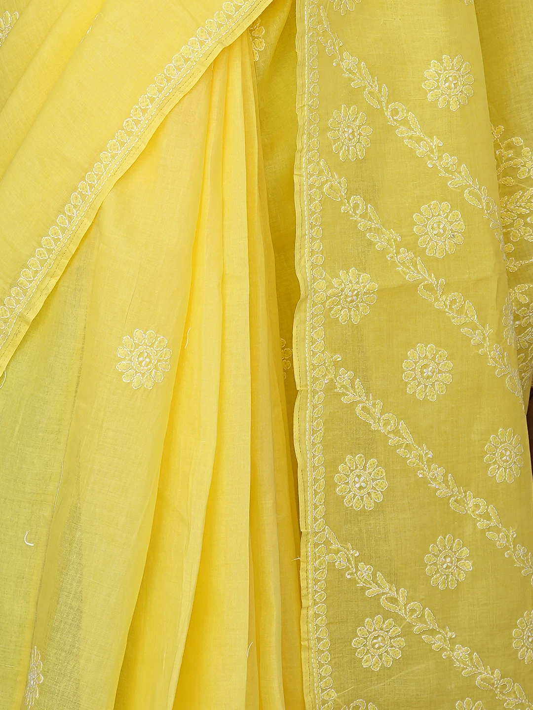 Ada Hand Embroidered Yellow Cotton Lucknowi Chikankari Saree With Blouse 01A866235