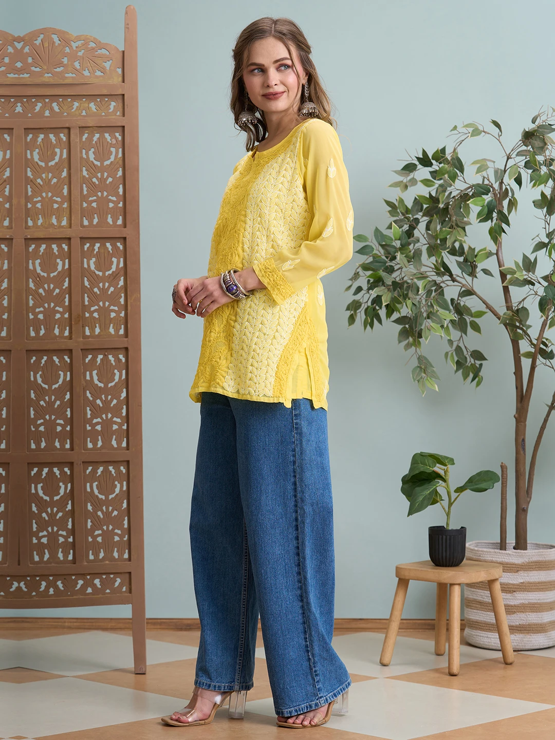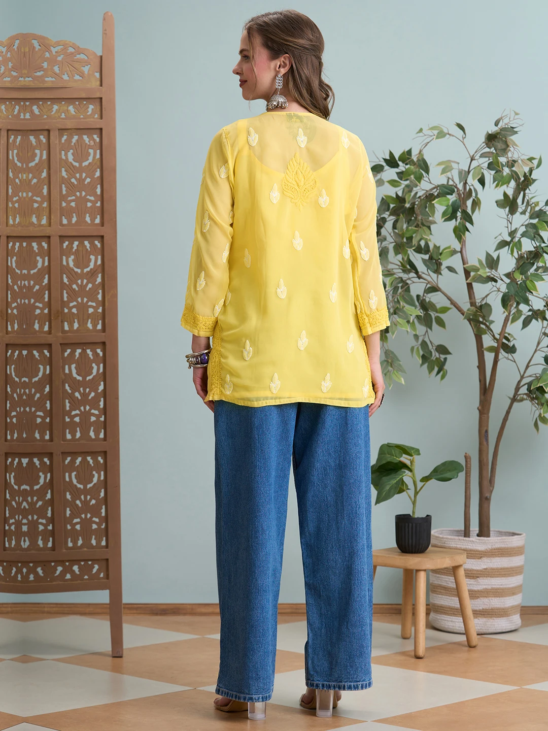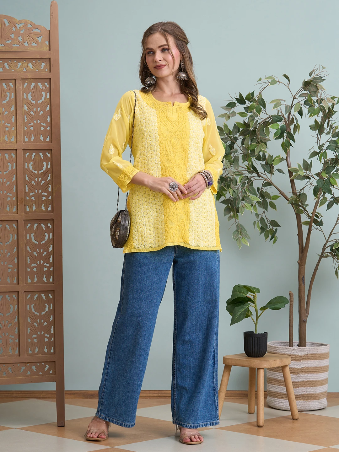 Ada Hand Embroidered Yellow Georgette Lucknowi Chikankari Short Kurti A911517