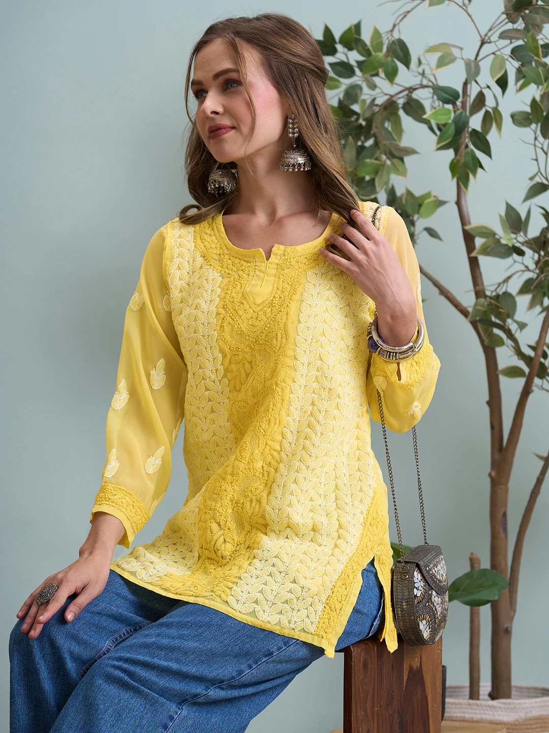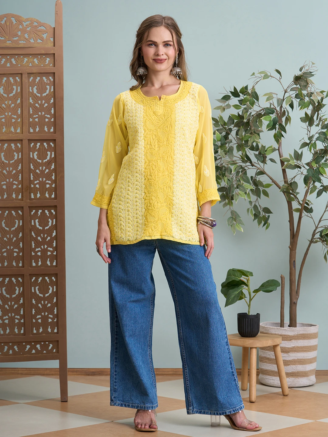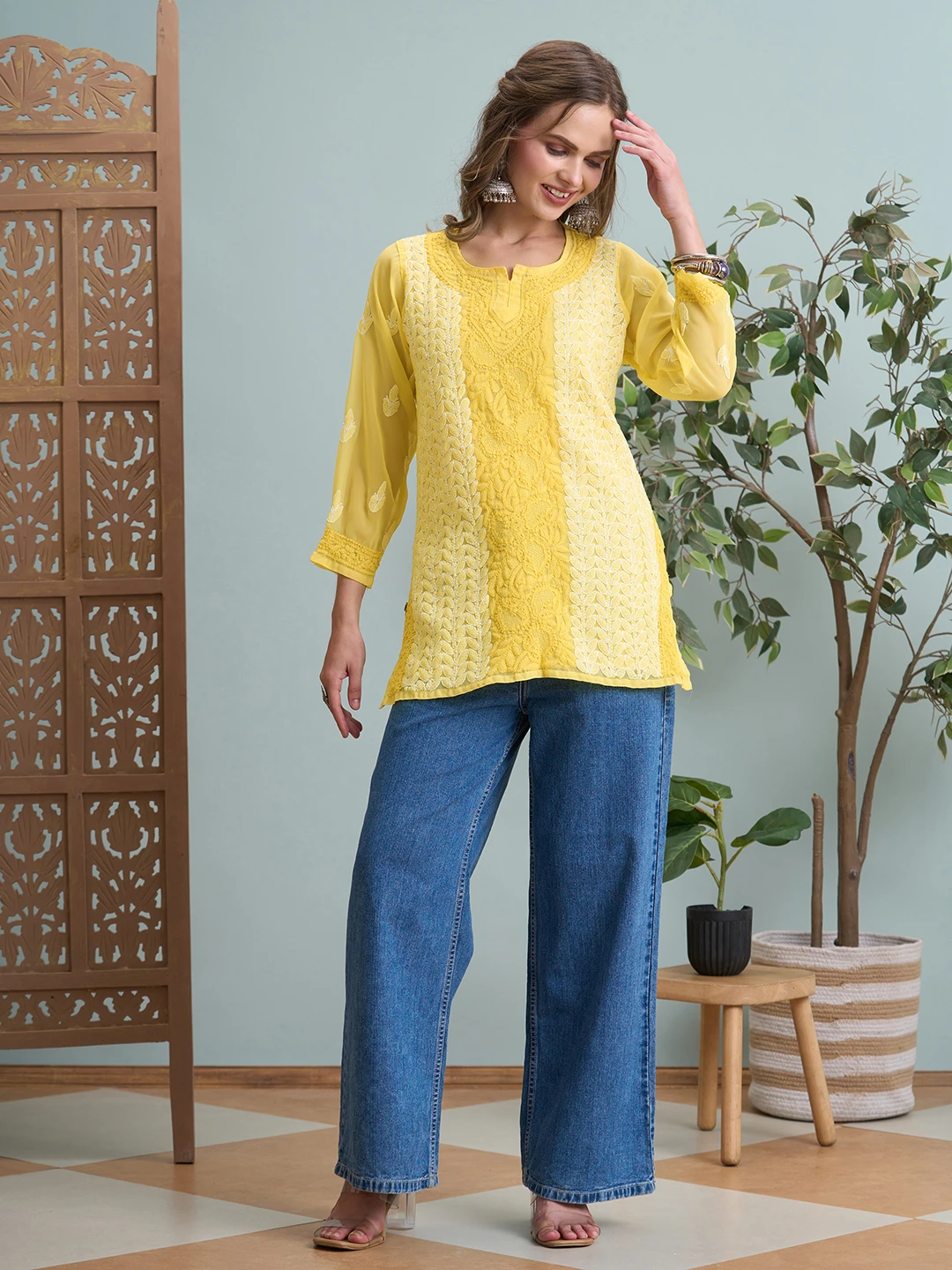 Ada Hand Embroidered Yellow Georgette Lucknowi Chikankari Short Kurti A911517