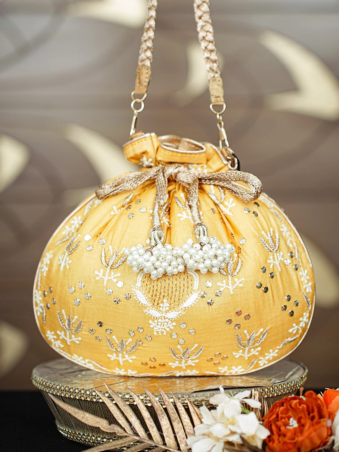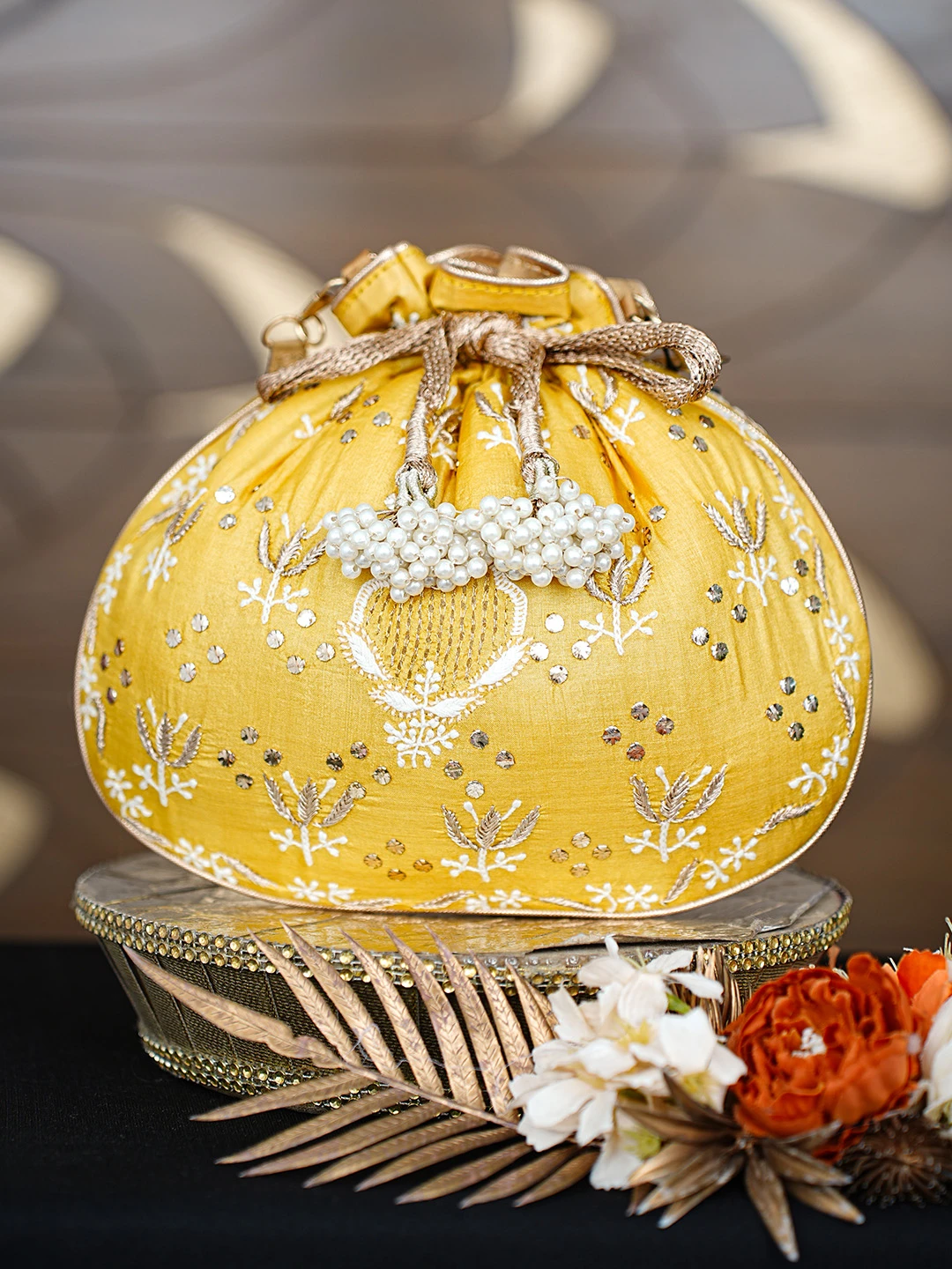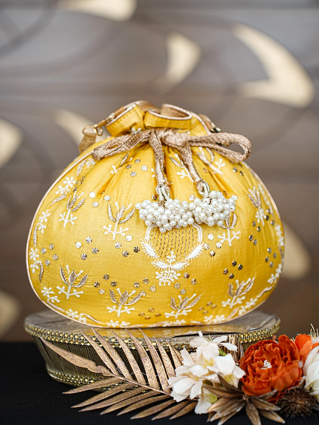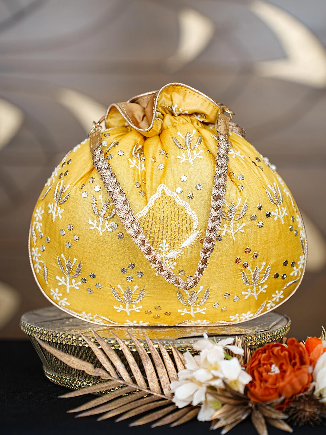 Ada Hand Embroidered Yellow Silk Lucknowi Chikankari Potli Bag With Zari Work 01A818789